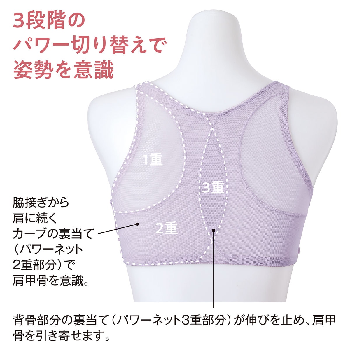 3段階のパワー切り替えで姿勢を意識 1重 2重 3重 (1)脇接ぎから肩に続くカーブの裏当て(パワーネット2重部分)で肩甲骨を意識。(2)背骨部分の裏当て(パワーネット3重部分)が伸びを止め、肩甲骨を引き寄せます。