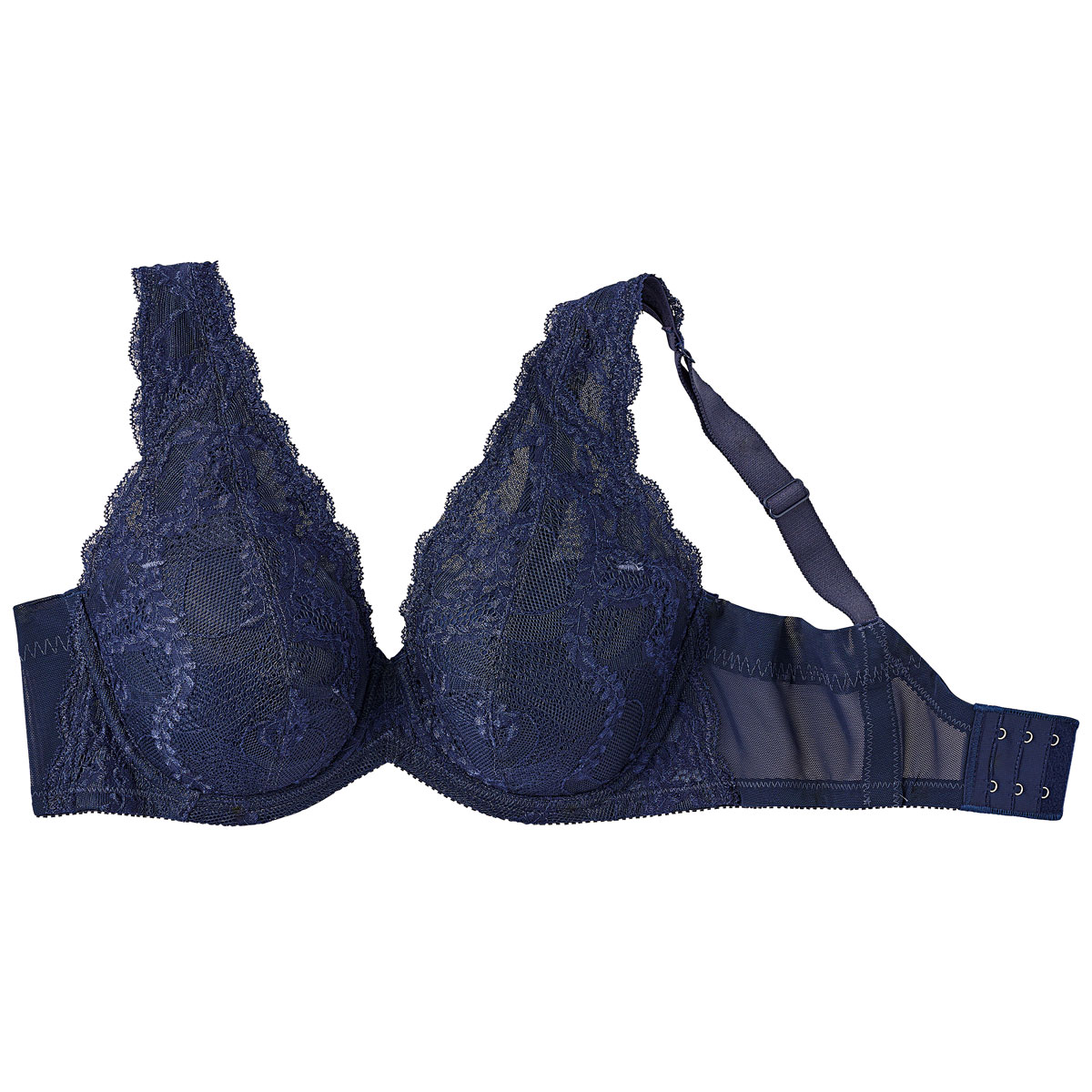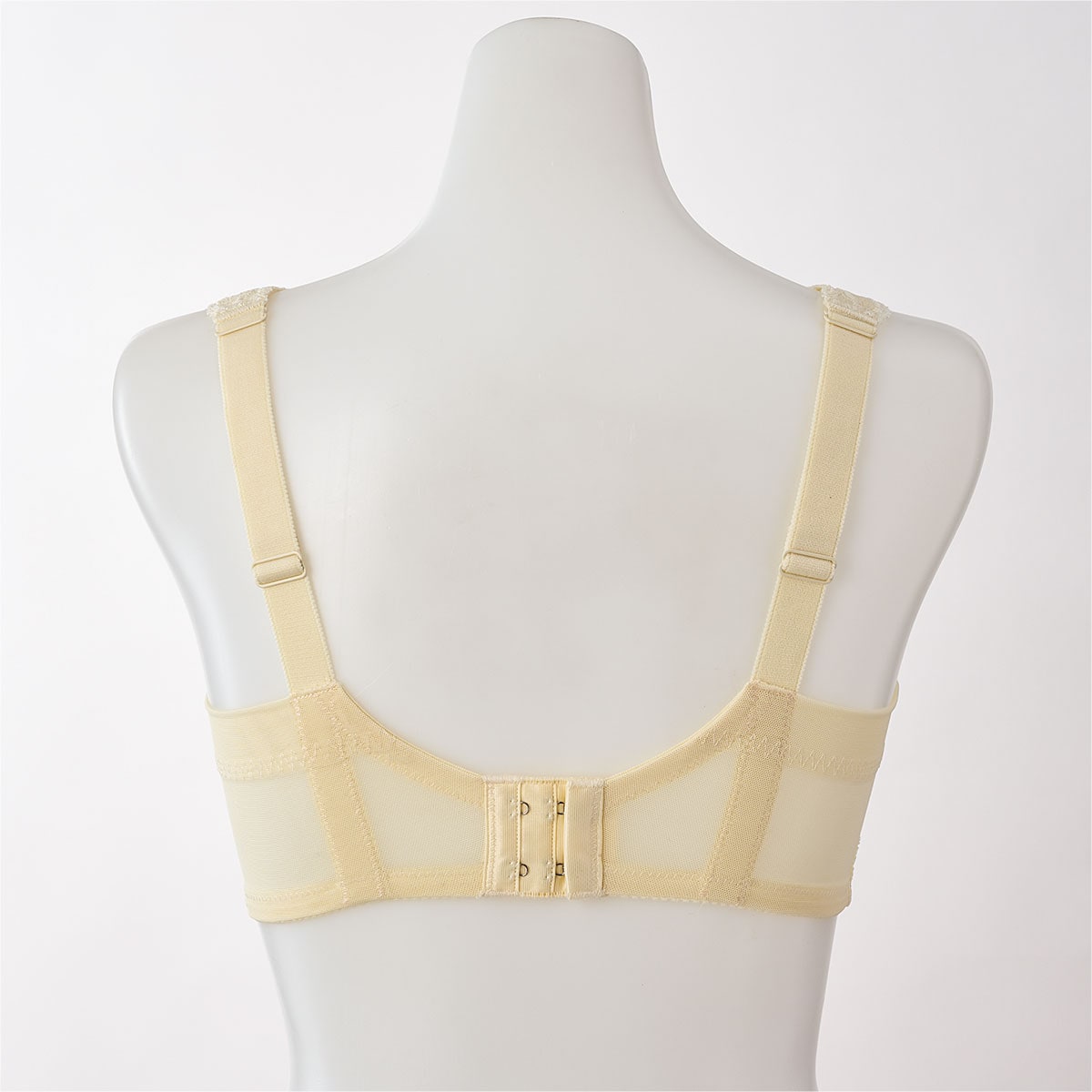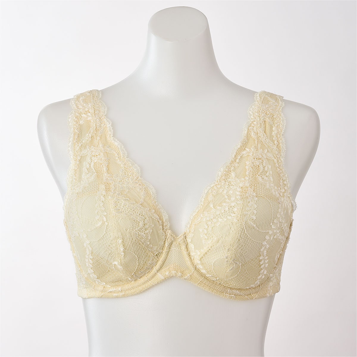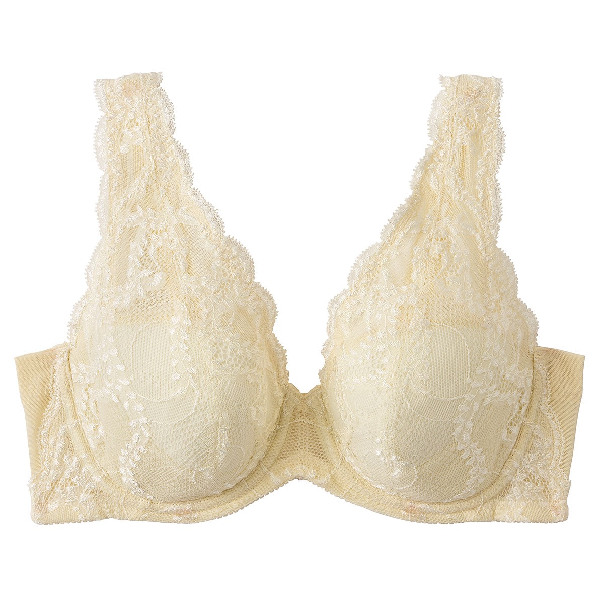 幅広ストラップで肩がラク。アンダー大きめさんのバストをしっかり支える安定感がうれしい、エレガントなレーシィブラ