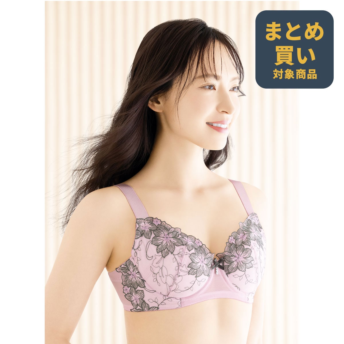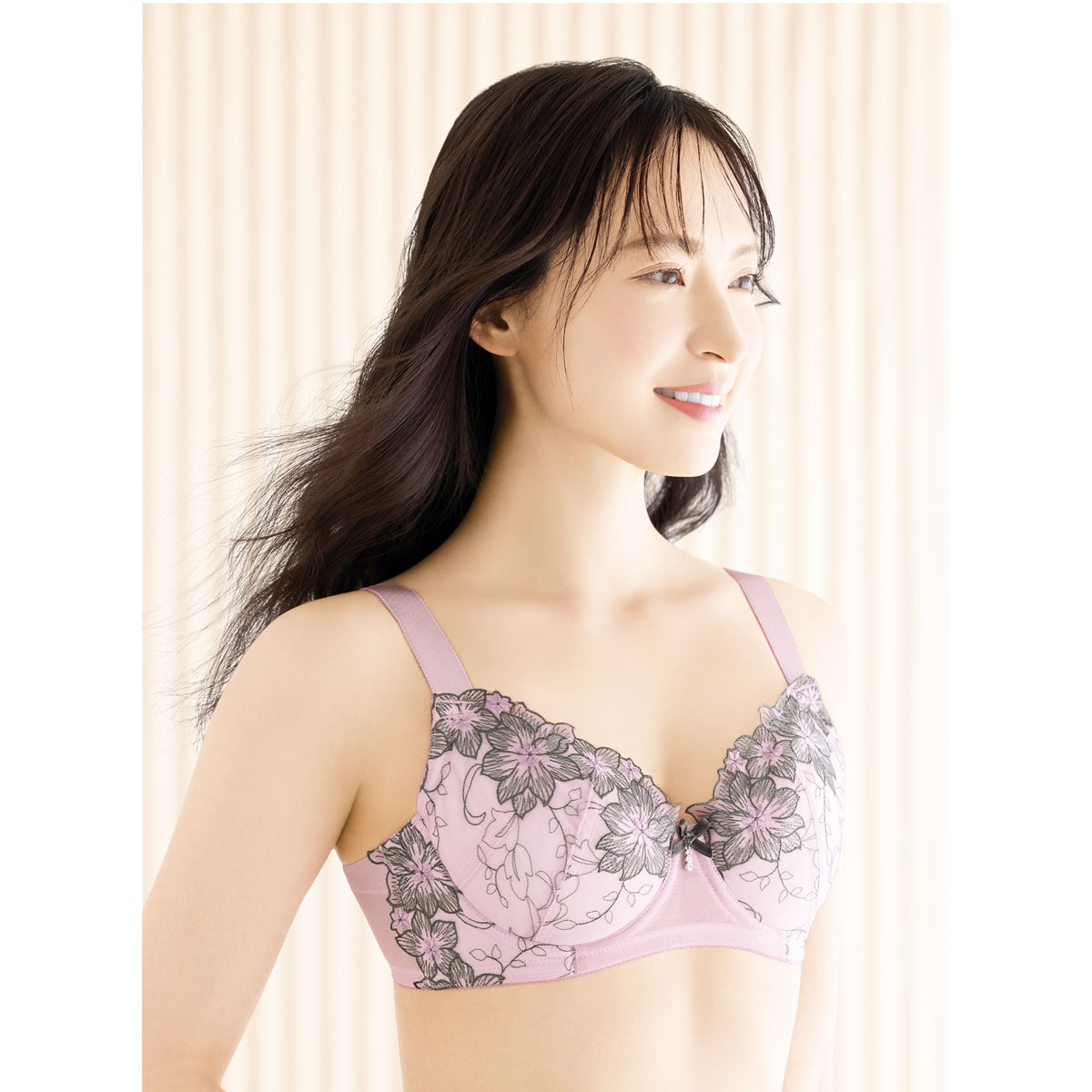 柔らかなグラマーバストをしっかり上向きにキープする「グラマーさんのバストをしっかり支えるブラ」。ボーン入りのカップと脇のパネルで、柔らかな胸を強制的に上向きに。太めストラップで持ち上げたバストをしっかり&ラクにキープします。着けるだけで、トップと鎖骨の真ん中を結んだラインが正三角形のコンパクトシルエットに。カラーはミスティピンクとノアールブルーの2色から。Eカップ~対応。