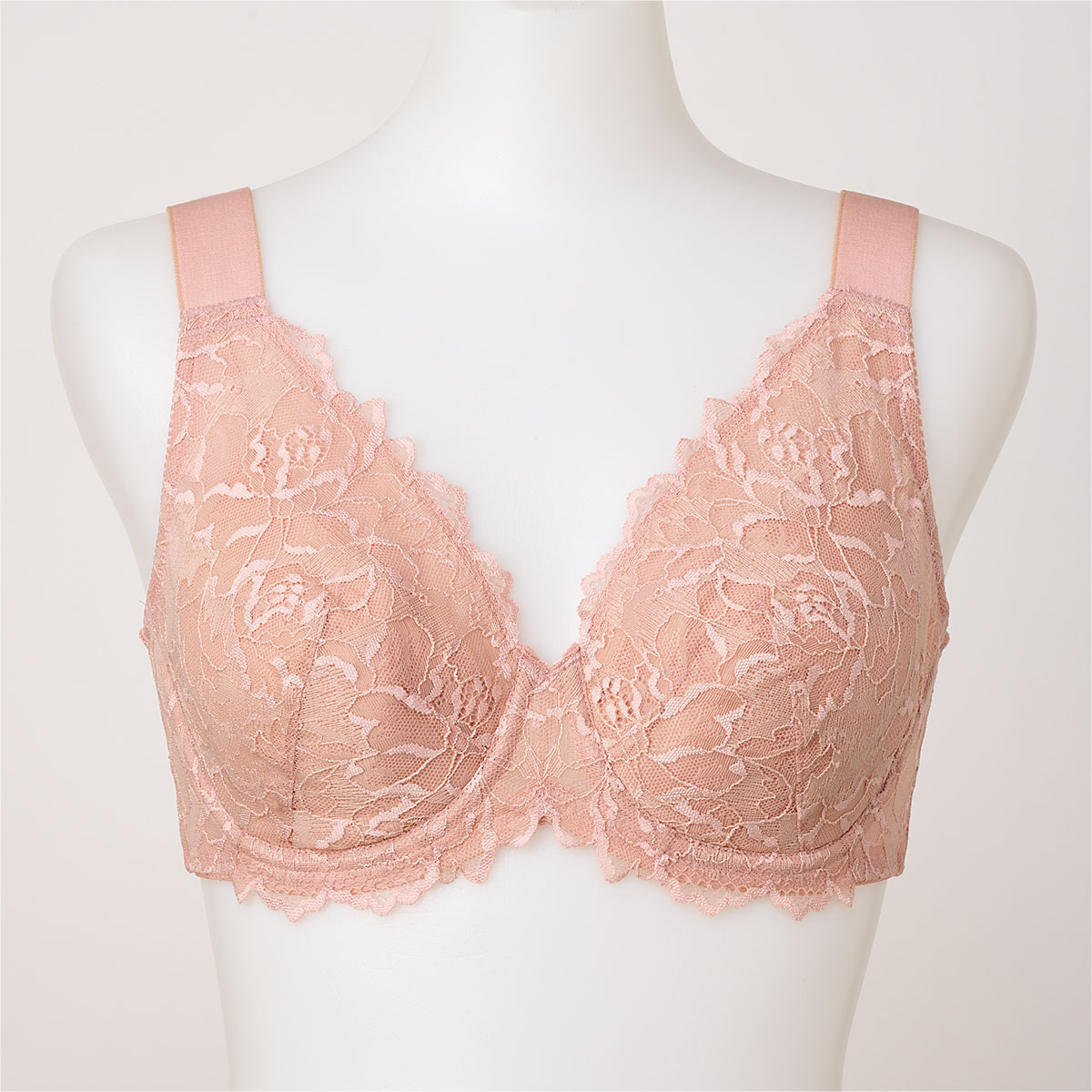 約30mmの極太ストラップを採用し、しっかりとバストを支えて引き上げるブラ。幅広なので、肩へのくい込みも軽減。3枚接ぎカップで丸みのあるきれいなバストに仕上げます。さらに、カップ裏のパネルで下カップもすっきり。同系色のレースが上品さを醸し出す。カラーはミスティローズとティールブルーの2色展開。