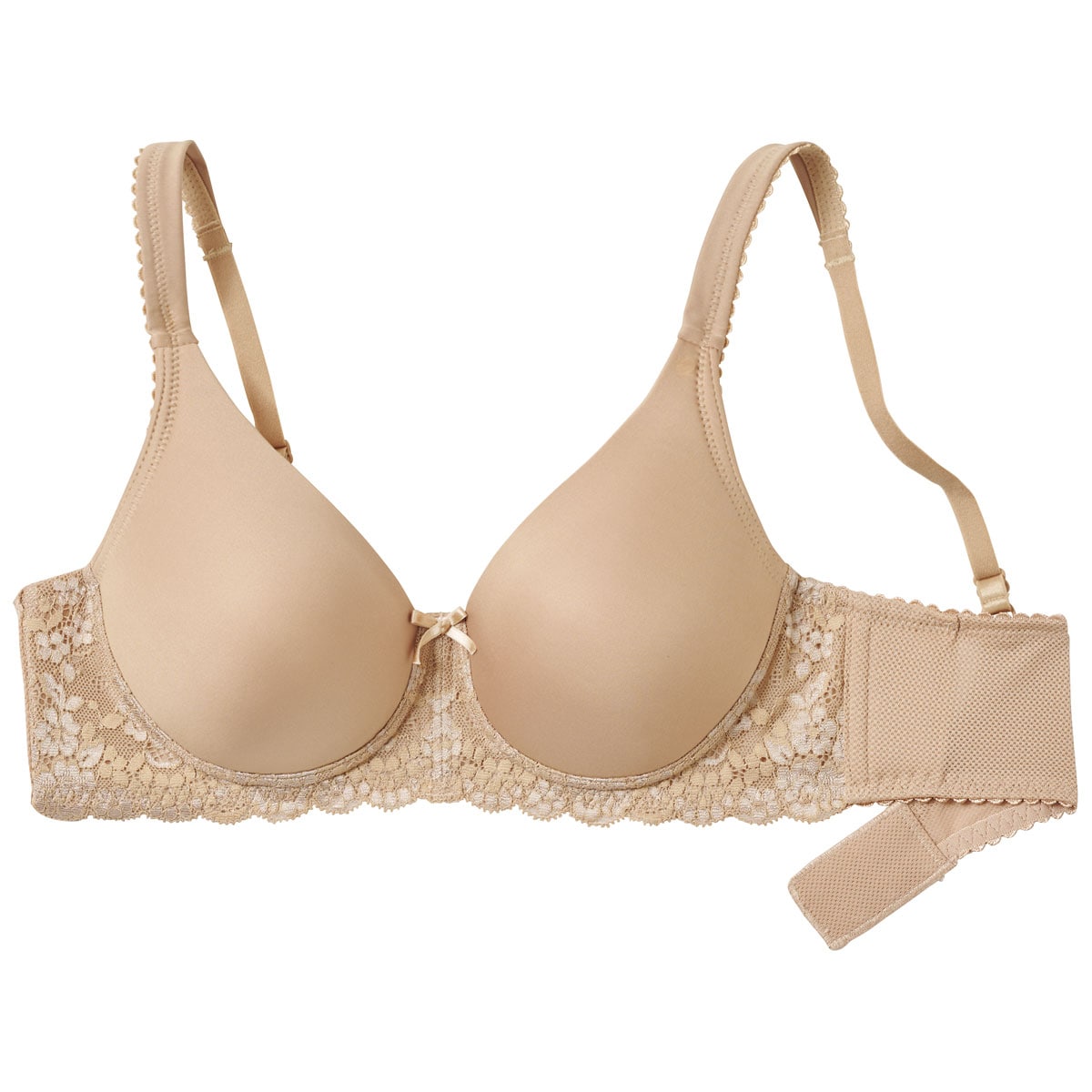 A(スキンベージュ)(1)上辺も厚めでパカパカ軽減。(2)よく伸びるストラップで肩がラク。(3)クッションパネル付で脇がしっかり安定。(4)フック裏も身生地でくるんでサラサラ。