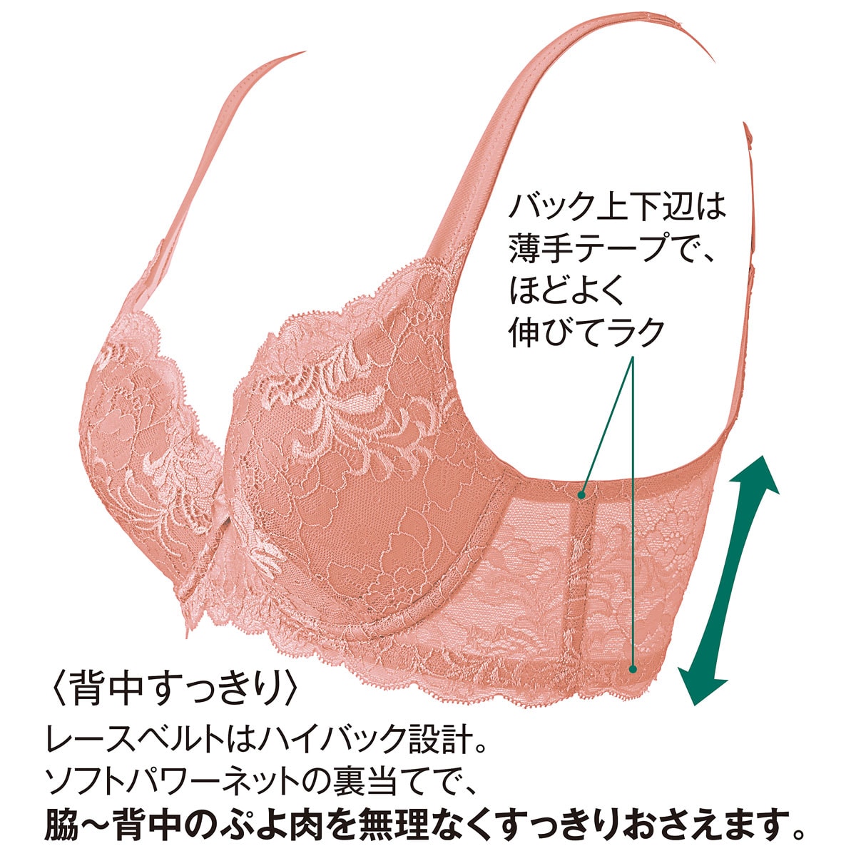 ふんわりやわらかなストレッチカップがバストにぴったりフィット。ハイバック設計で脇背中もすっきり!デイリーにおすすめのこだわりブラ。