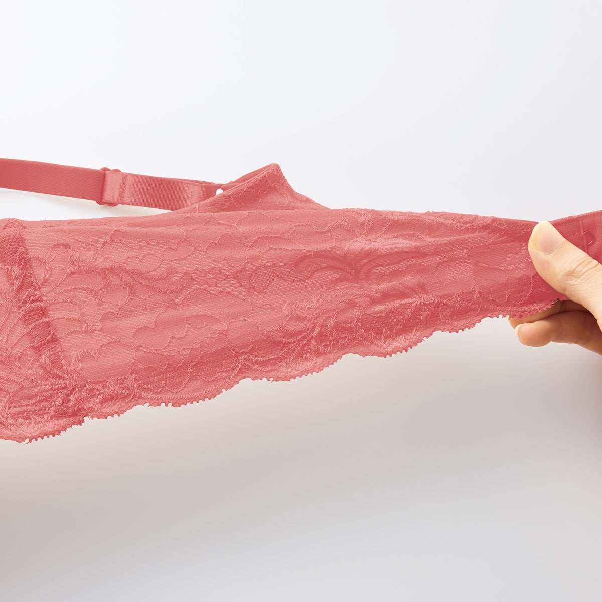 締めつけを軽減 バック上下辺は薄手テープで、ほどよく伸びてラクな着け心地。ストラップはよく伸びるから、肩にくい込みにくい。 のび~る※画像はスモークピンク