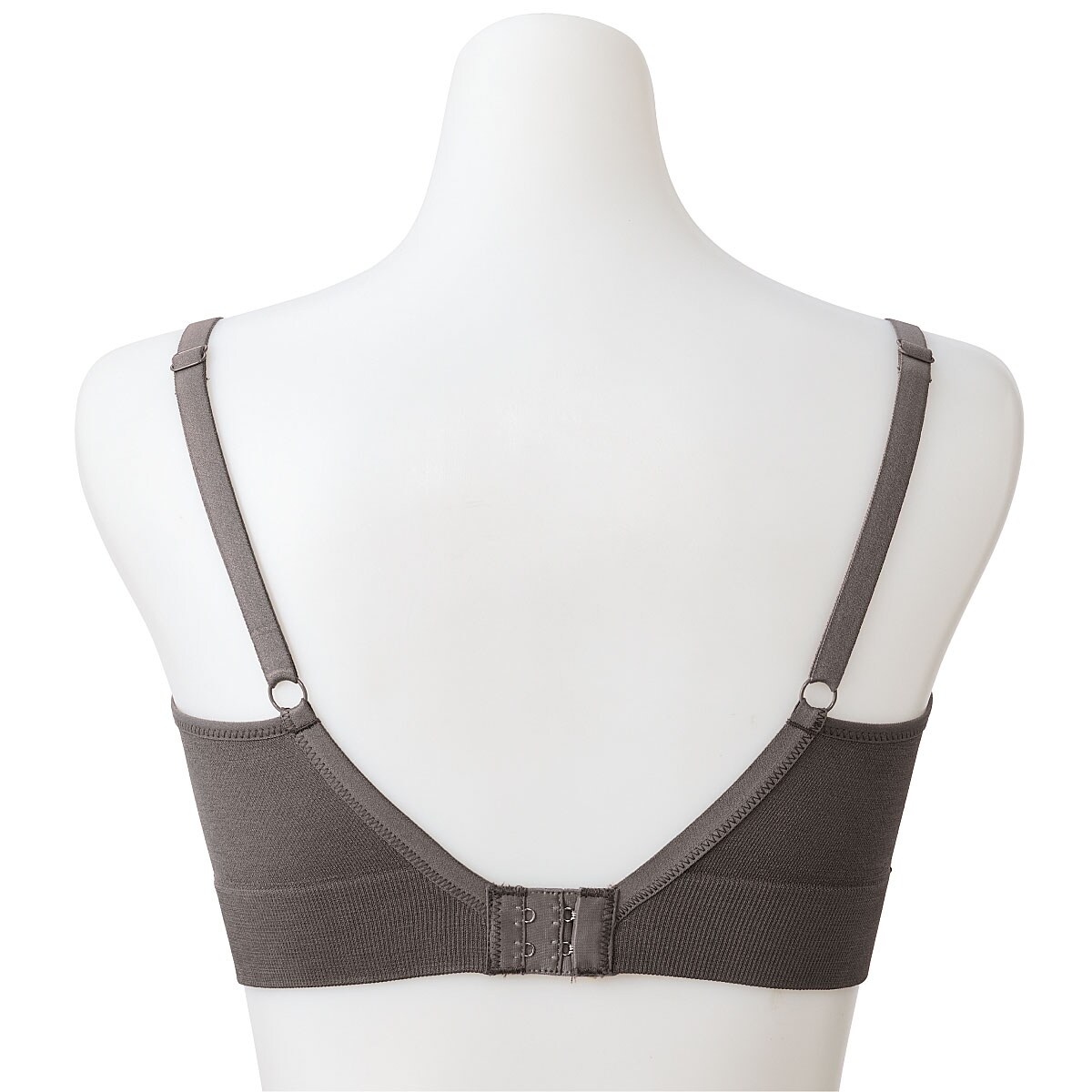 成型編みで心地いい解放感を実現した「毎日着たいブラ®」。ワイヤーなし、身生地は360度ストレッチで締め付け感軽減。特にアンダーはグーンと伸びてくい込まず、幅広で安定感あり。それでいて、トップ位置の高いモールドカップ、左右のカップを引き寄せるハンモック風パネルなどで無理なく美胸に整えます。バスト脇から背中を広くカバーする設計だから、脇肉や段差をおさえてサイドも背中もすっきり。身生地は吸汗・速乾素材、カップ裏は吸汗・速乾メッシュと、快適さにもこだわりました。
