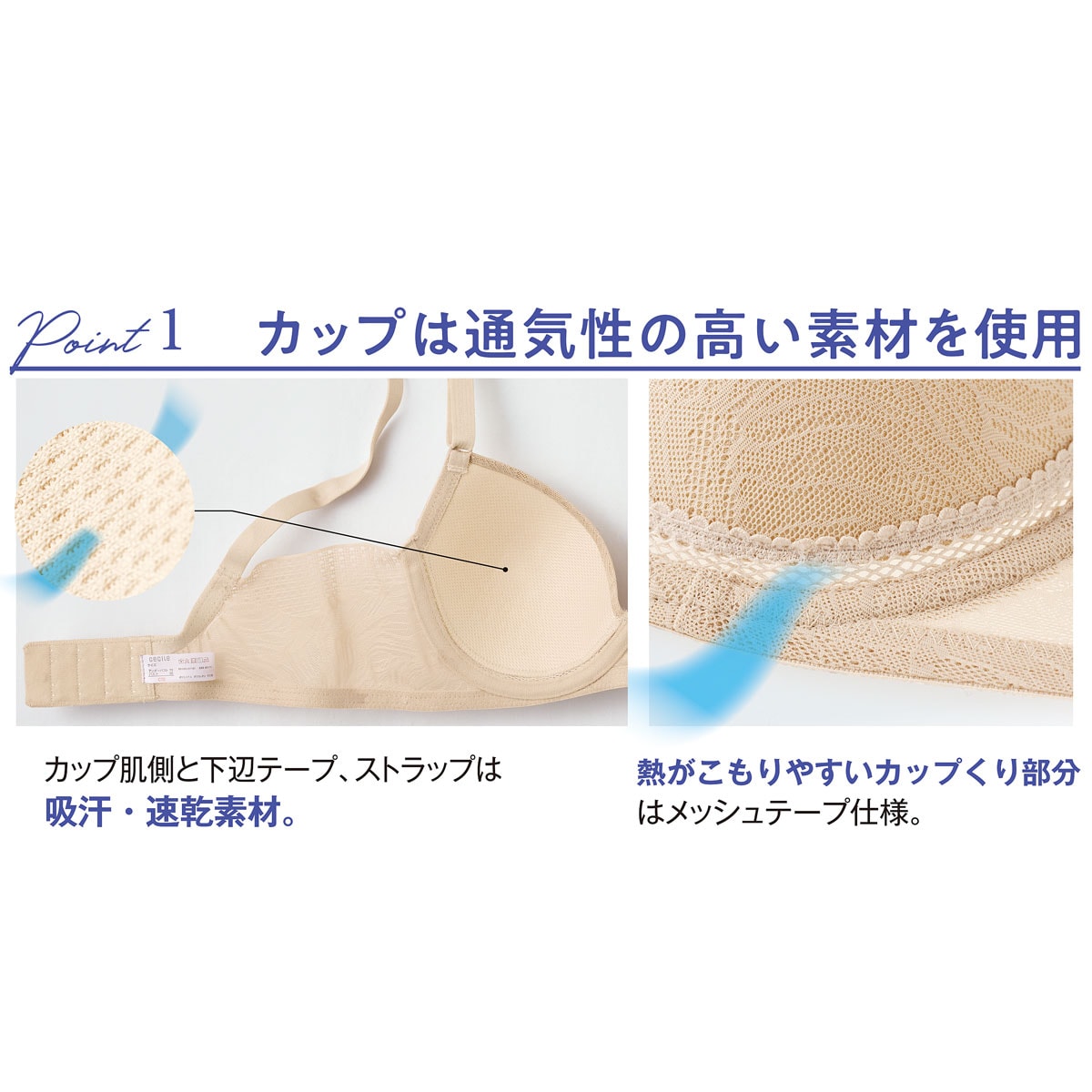 カップには通気性の高い素材を採用。熱がこもりやすいカップくり部分は、メッシュテープ仕様。カップ肌側とストラップ、下辺テープ部分にも吸汗速乾素材を使用。