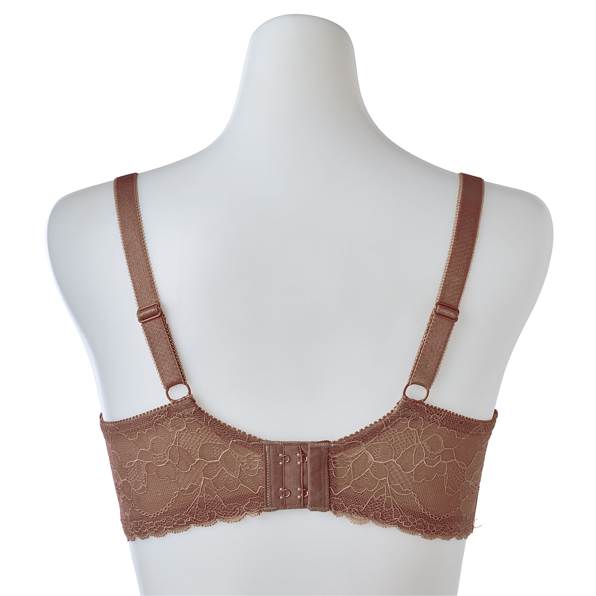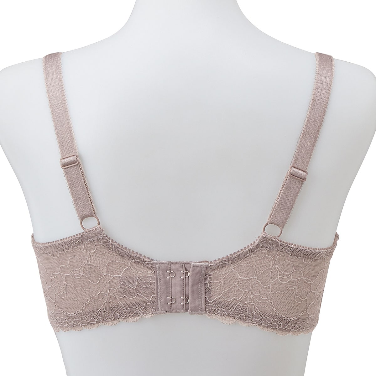 ローズグレー (1)約15mm~幅広ストラップ+肌側のポコポコでくい込みにくく、ズレにくい。(2)モールドカップ特有の厚みをなくし、グラマーバストにフィット。(3)空気がスーッと通る穴あきシームレスカップ(4)レース+パワーネットの裏当てで軽やかに安定。