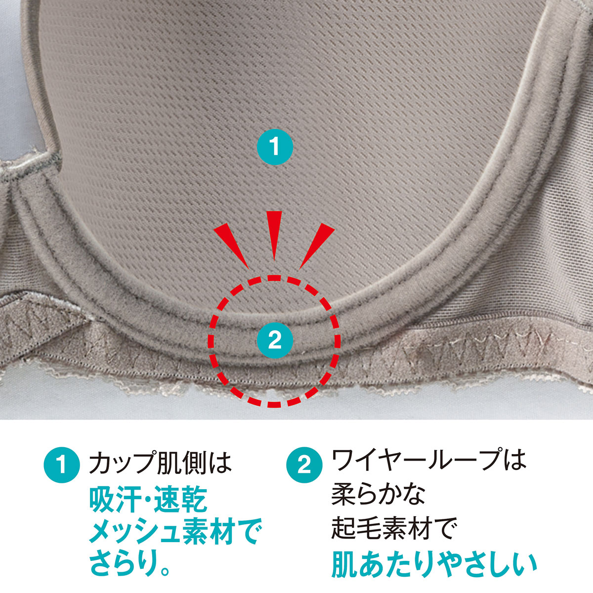 (1)カップ肌側は吸汗・速乾メッシュ素材でさらり。(2)ワイヤーループは柔らかな起毛素材で肌あたりやさしい