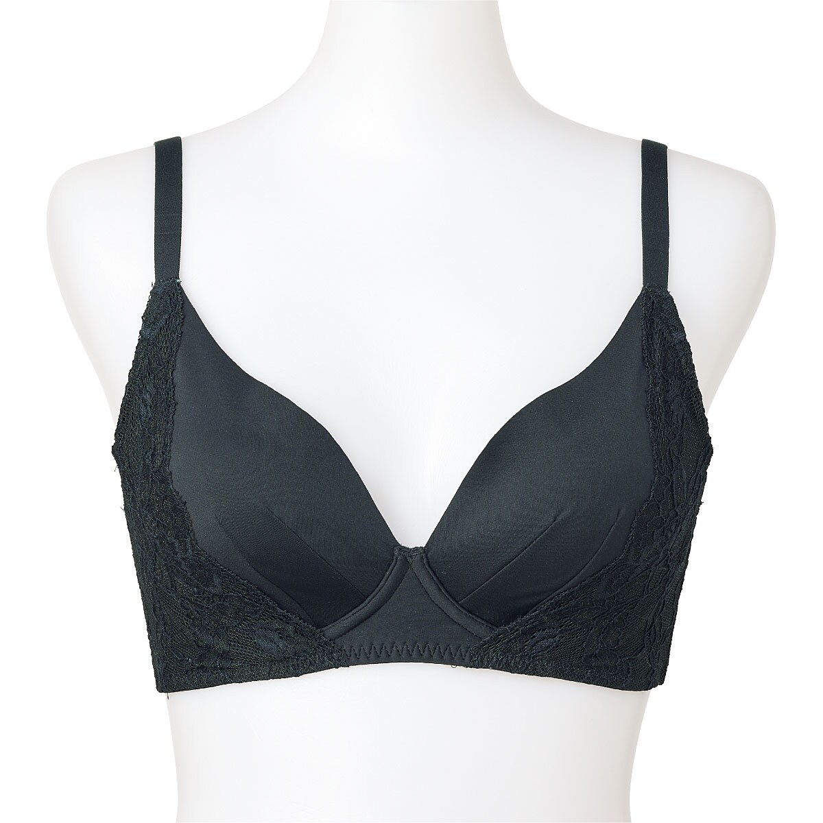 (1)バストになじむやわらかストレッチモールドカップで、ワイヤーなしでもきれいな丸胸をキープ。(2)切りっぱなし仕様だからくい込みにくい。