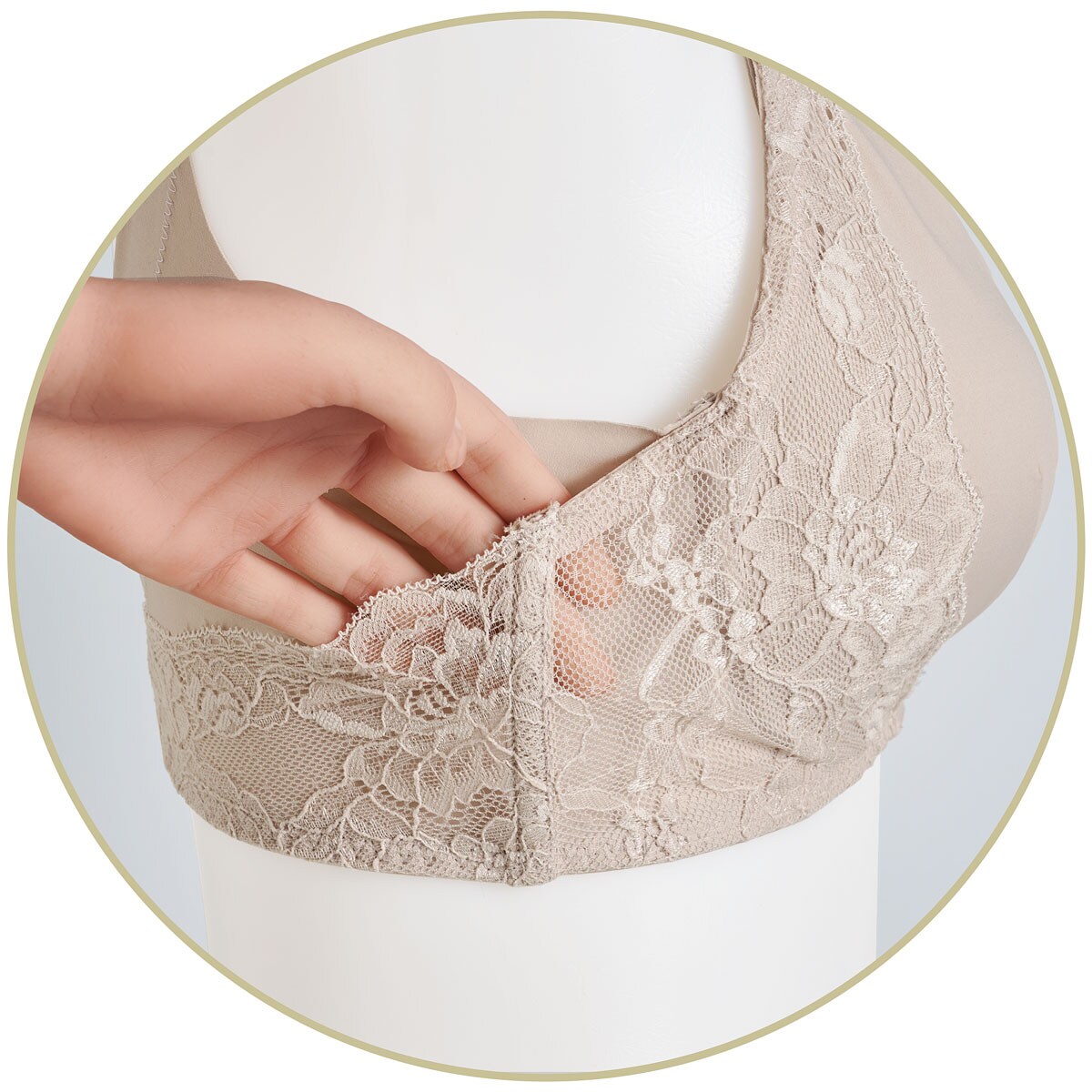 レースパネルは身生地に縫い付けない仕様で、やさしくお肉をおさえてフィット。パネルにボーンを入れることで肌側に縫い目もなくやさしい着心地に。