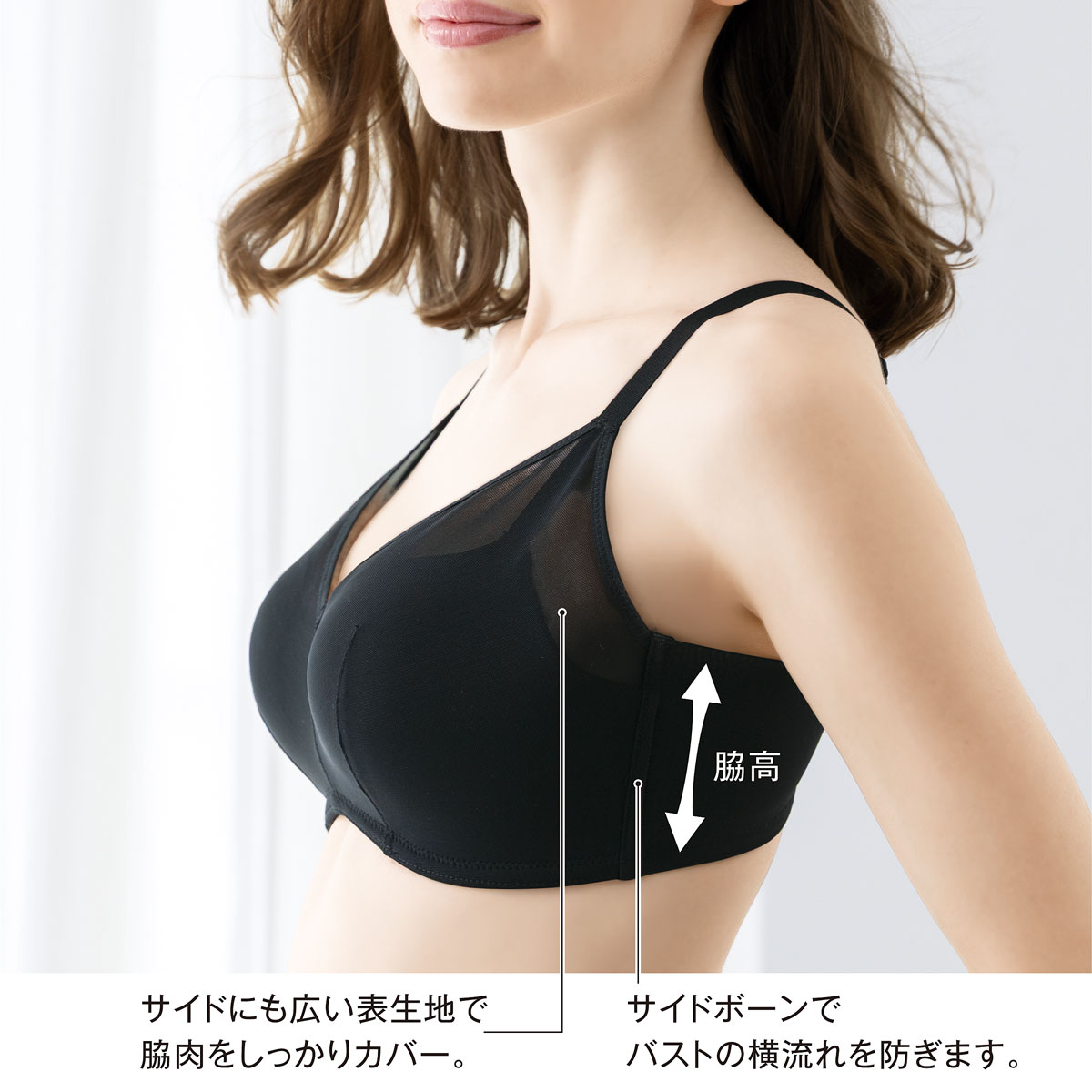 体にあわせた立体(3D)設計だからぴったりフィット。カップからサイドまで体の丸みにフィットして楽ちん。つけることで上向き・内向きになってサイドはすっきり。グラマーさんの大きなバストを全体的にすっぽり覆う表生地のパワーネットで安心感もアップ↑表生地はカップ本体とは縫い付けない仕様でバスト上辺にピタッとなじみます。前中心も高く谷間をしっかりカバー。ストラップは表生地とカップにつながっているのでバストをしっかり引き揚げます。ワイヤーなしなのに安心感もあり美胸に整えてくれます。3Dブラの着け心地をグラマーさんにも♪