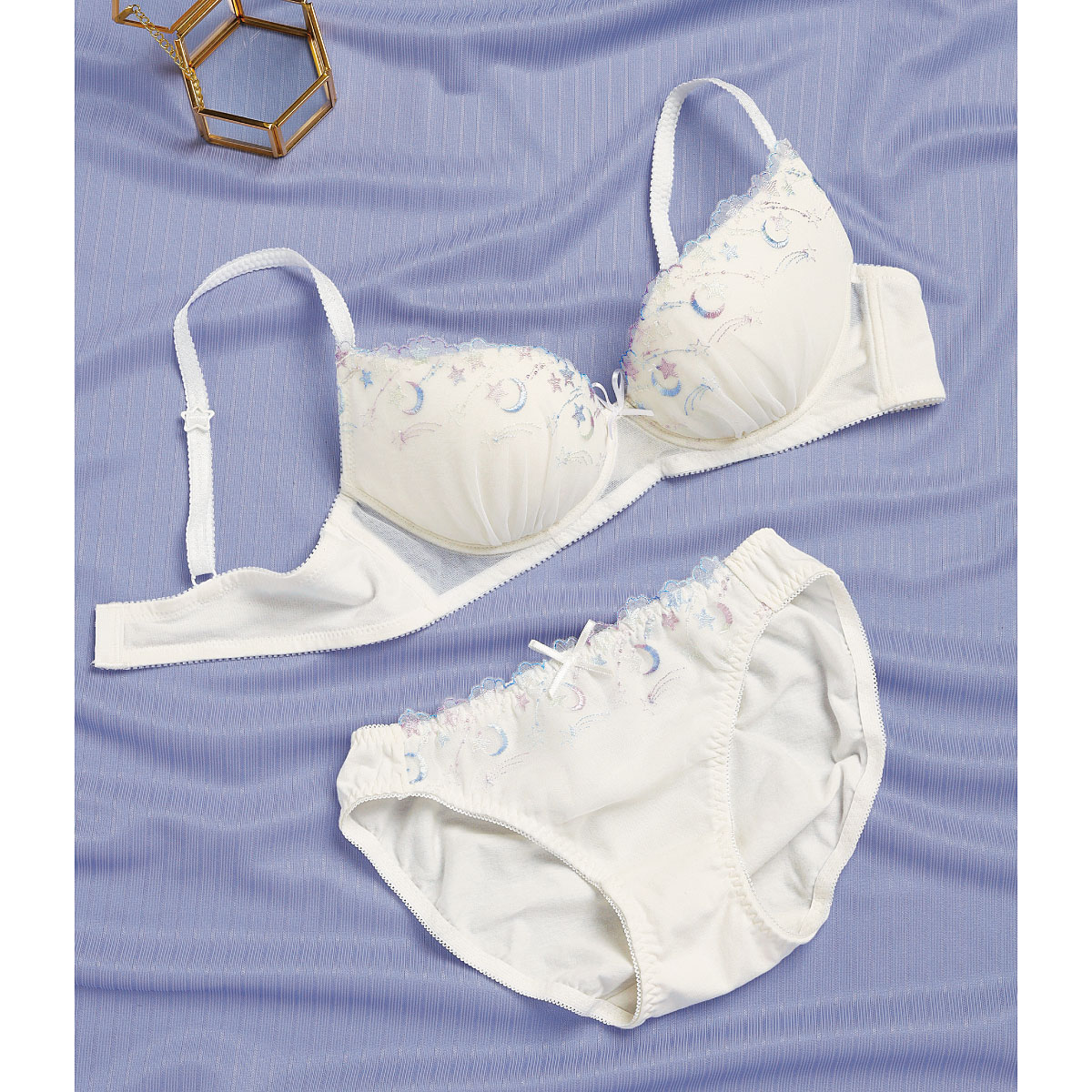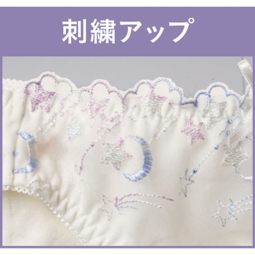 +:。.。2024年2月新発売。.。:+夜空をモチーフにした刺繍を、繊細なグラデーションカラーで仕上げました。ホワイトにブルートーンの刺繍がとっても上品です♪肌に触れるカップ裏は綿100%の生地を使用していて、やさしくバストを包みます。内部のモールドカップは通気性がよく、活発なティーン世代にもぴったりです。ストラップ調節部分は星形のアジャスターでワンポイントに!サイズのM・Lはショーツのサイズになります。