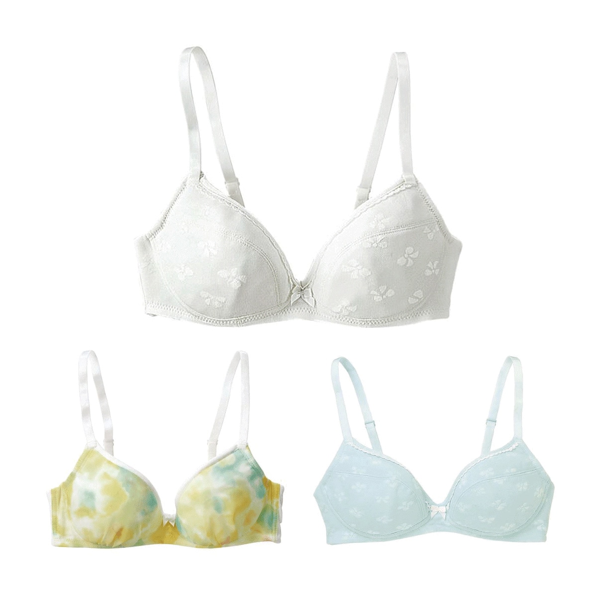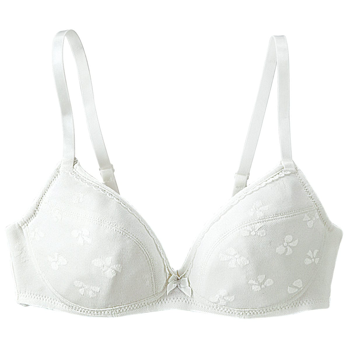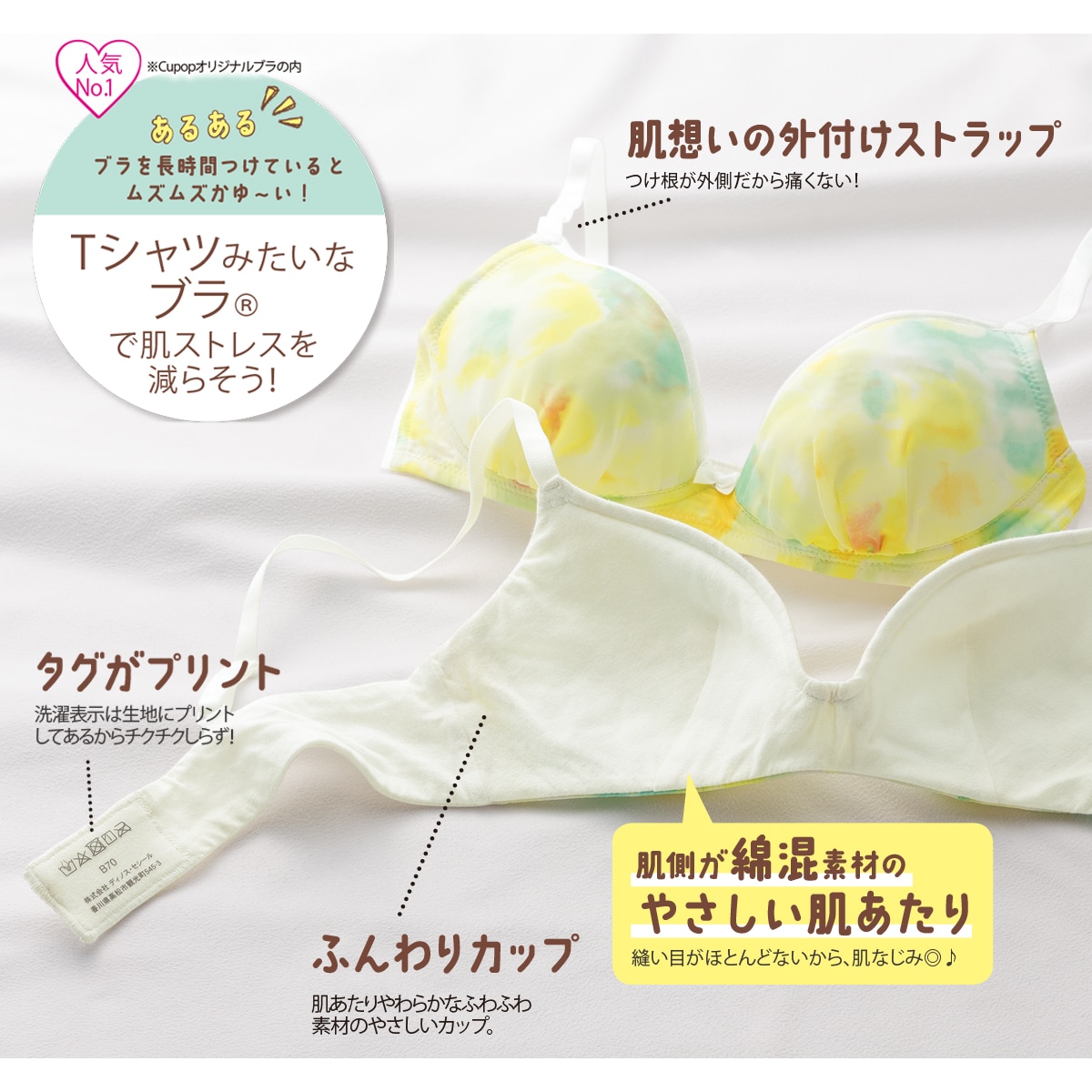 Tシャツを着ているみたいに快適な着け心地で人気のTシャツみたいなブラ®がとってもやさしいふわふわ素材のカップでティーン向けに!肌あたりふんわりやわらか。かゆくなりがちな、カップ裏の縫い目やタグをなくして、肌への刺激をおさえたよ。カップ裏は綿混Tシャツ素材だから肌になじみやすい。ストラップのつけ根が外側だから痛くない!ファーストブラにもおすすめです。