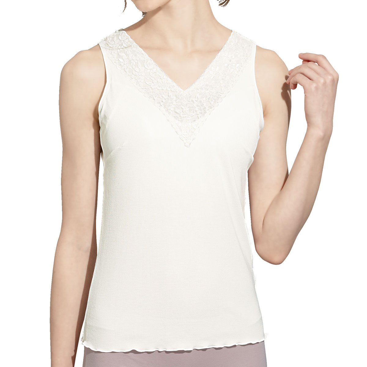 ブラジャーを内蔵したタンクトップ。背中は肩甲骨の間を意識するようにYバックのパワーネット仕様。着るだけで背筋を意識してピンっと伸ばし若々しい印象に。襟ぐりはレース仕様。レースは身生地の上に付けているので肌が透けません。カップ上辺はかがんでも胸元が見えないようになっています。身生地はリブ素材で締め付けず心地よい着用感です。