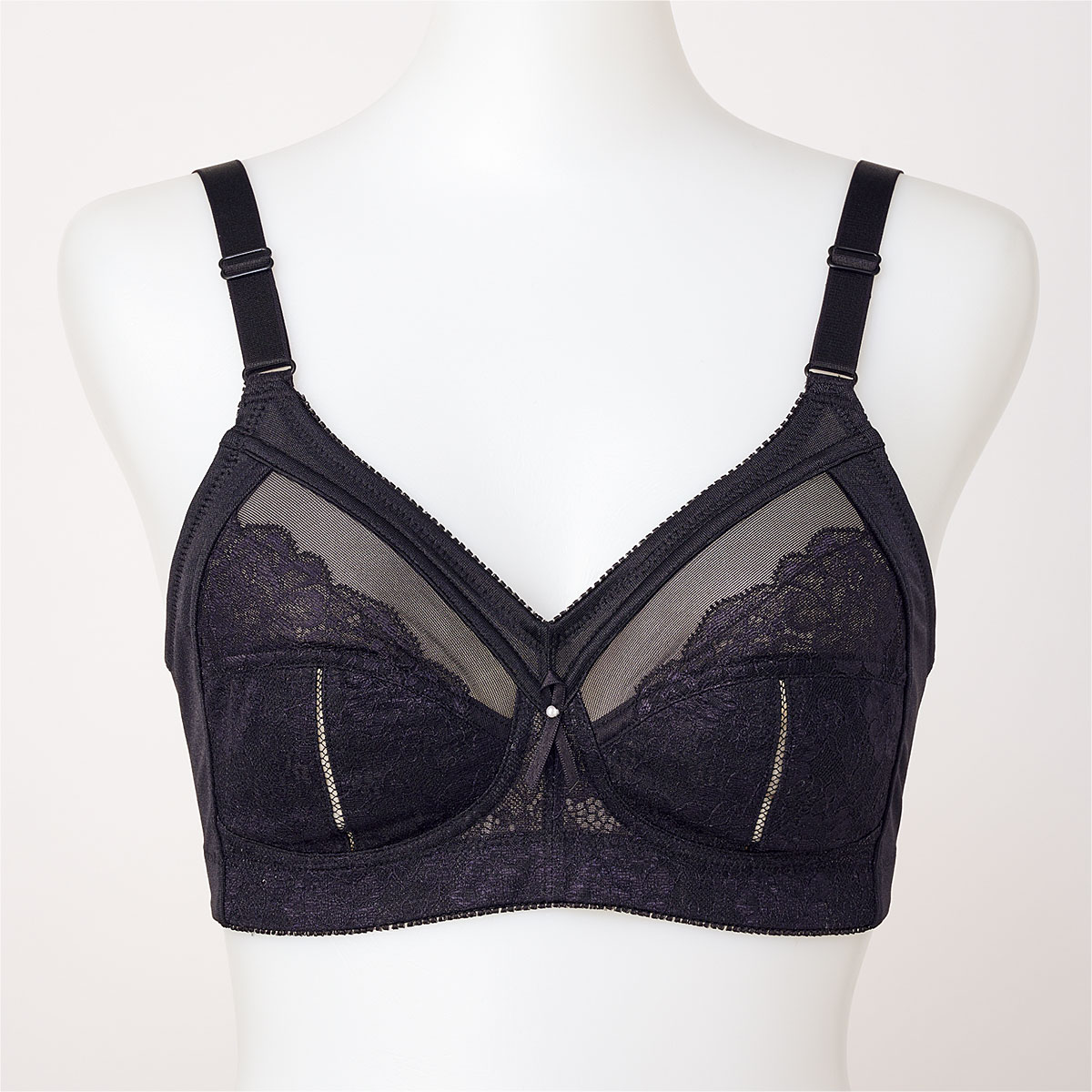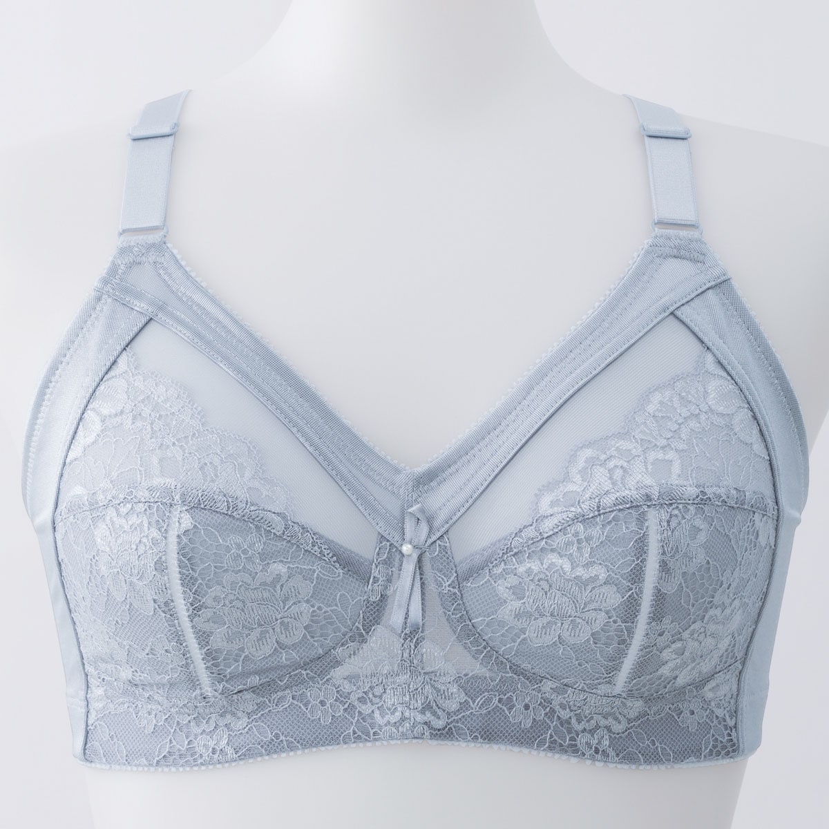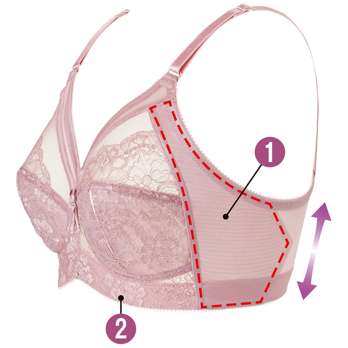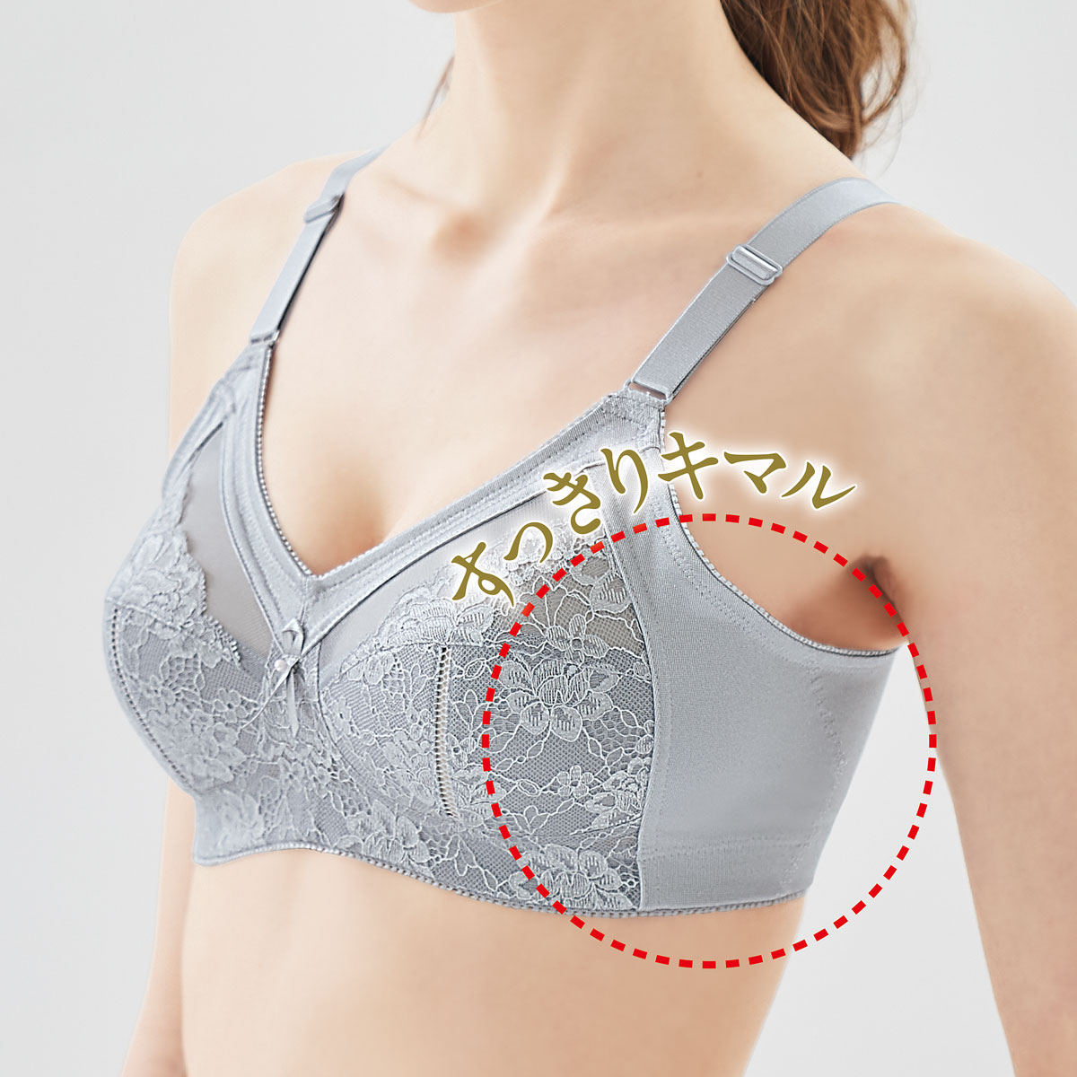 通常のノンワイヤーブラではバストが流れる、広がるなど、シルエットや安定感が不満なグラマーさんのお悩みを解決!バストを囲うように支える額縁カップで、ワイヤーなしのラクな着け心地ながらしっかり安定するブラです。生地とレースのみの薄手カップでボリュームが目立ちにくく、サイドは脇肉をシェイプし、バストの横流れも防ぐ裏当て付きで安心。アンダーは約25mmの幅広テープでくい込まず、安定感を高めます。「胸が目立たなくなって感激」と、お客様からうれしい声も!F85サイズまでご用意。