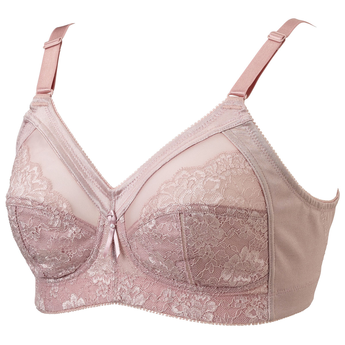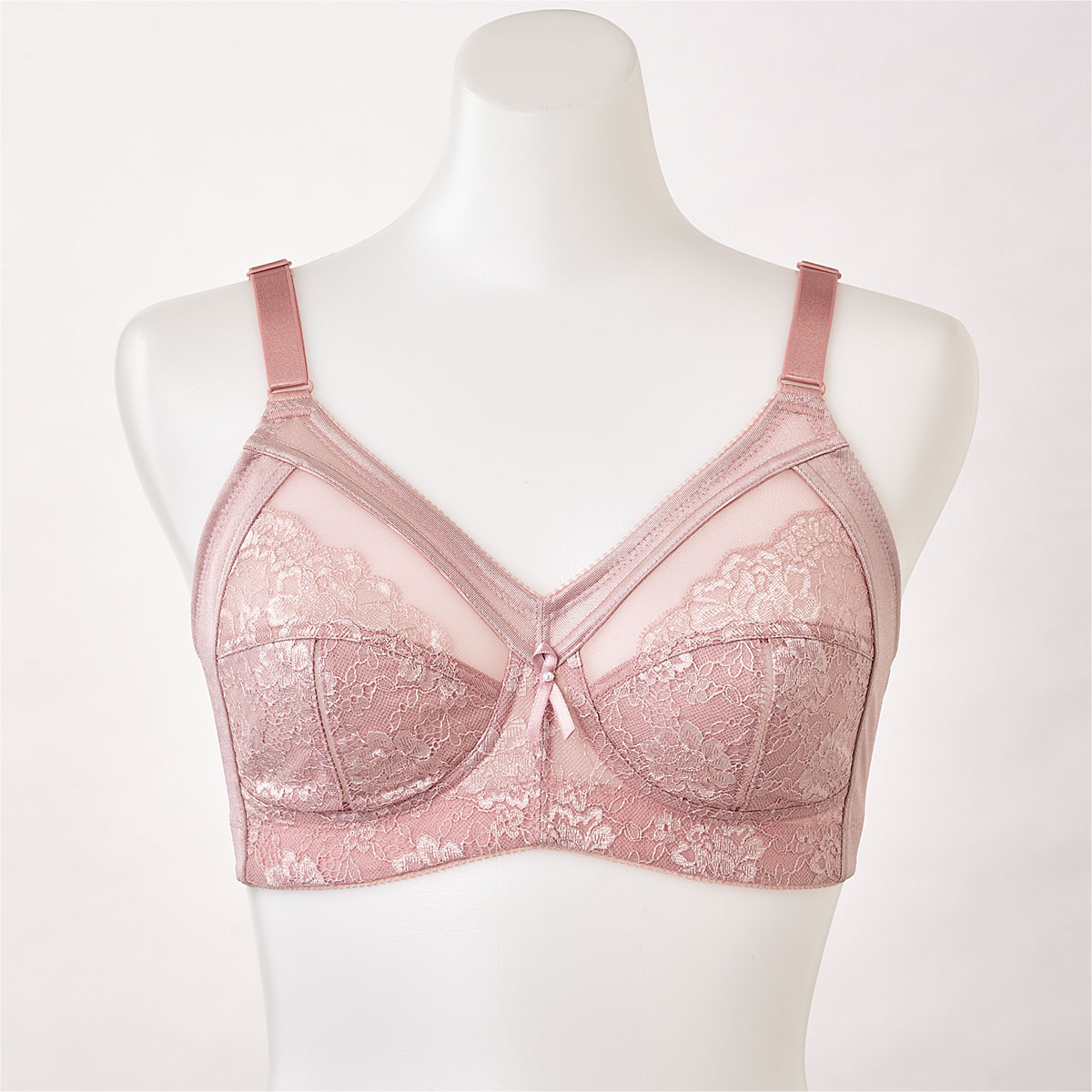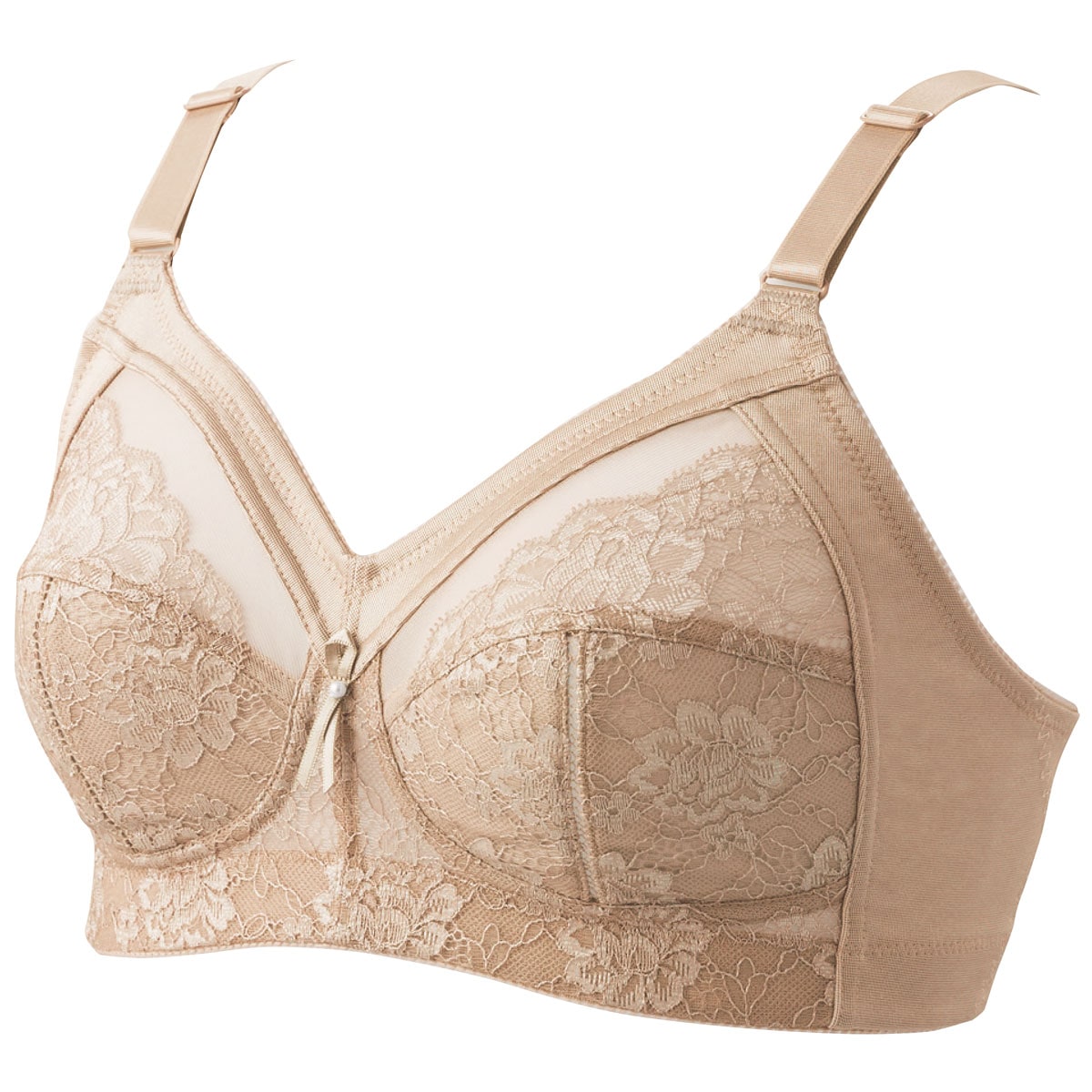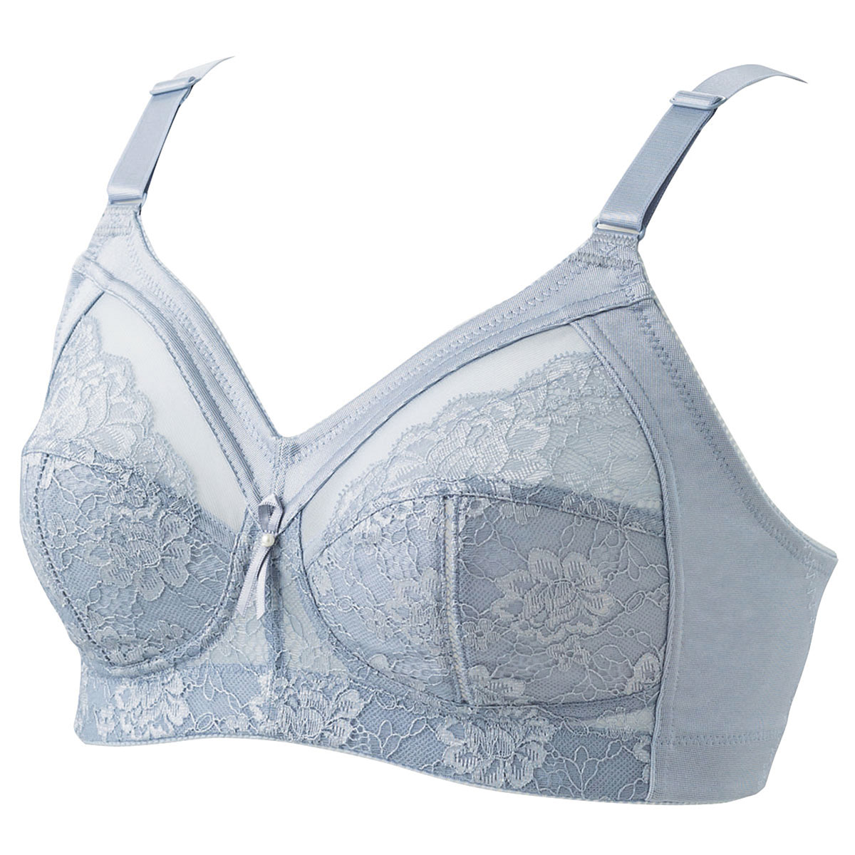 通常のノンワイヤーブラではバストが流れる、広がるなど、シルエットや安定感が不満なグラマーさんのお悩みを解決!バストを囲うように支える額縁カップで、ワイヤーなしのラクな着け心地ながらしっかり安定するブラです。生地とレースのみの薄手カップでボリュームが目立ちにくく、サイドは脇肉をシェイプし、バストの横流れも防ぐ裏当て付きで安心。アンダーは約25mmの幅広テープでくい込まず、安定感を高めます。「胸が目立たなくなって感激」と、お客様からうれしい声も!F85サイズまでご用意。