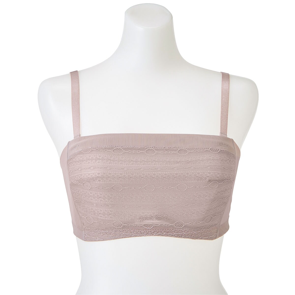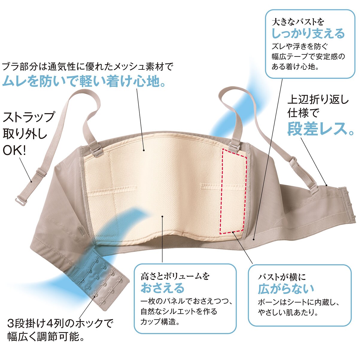 グレージュ (1)表カップレース裏に伸びない素材を貼り、おさえ込み、薄手でもコンパクトなバストに。(2)幅広の上辺ゴムでサポートするから安定感あり。