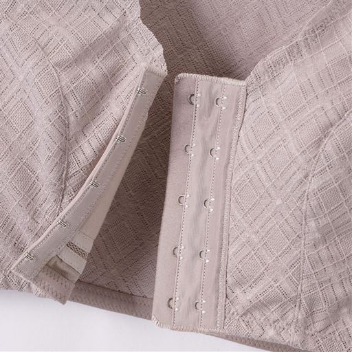 パワーのあるレースを使用して苦しくなく気持ちよく面でバストも背中もお肉をおさえます。カップは直立綿を使用、カップくりもメッシュ使用で通気性もよくムレを軽減。レースは脇はフリーカットでアウターにもひびきにくい。