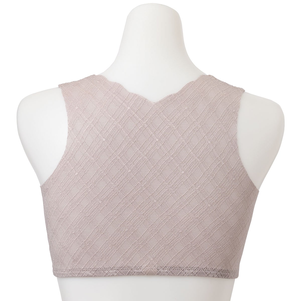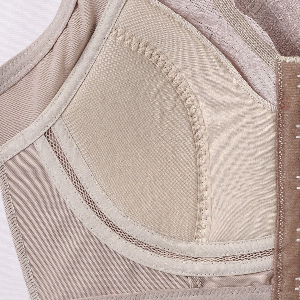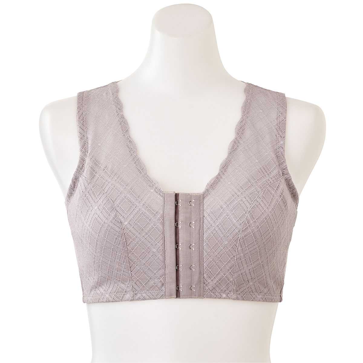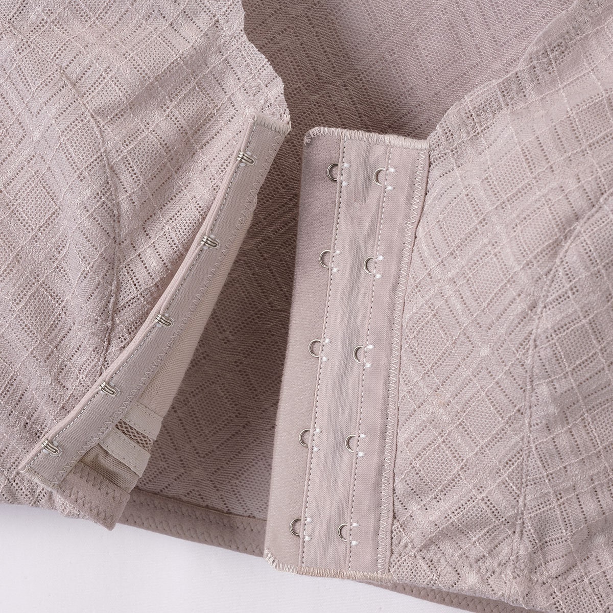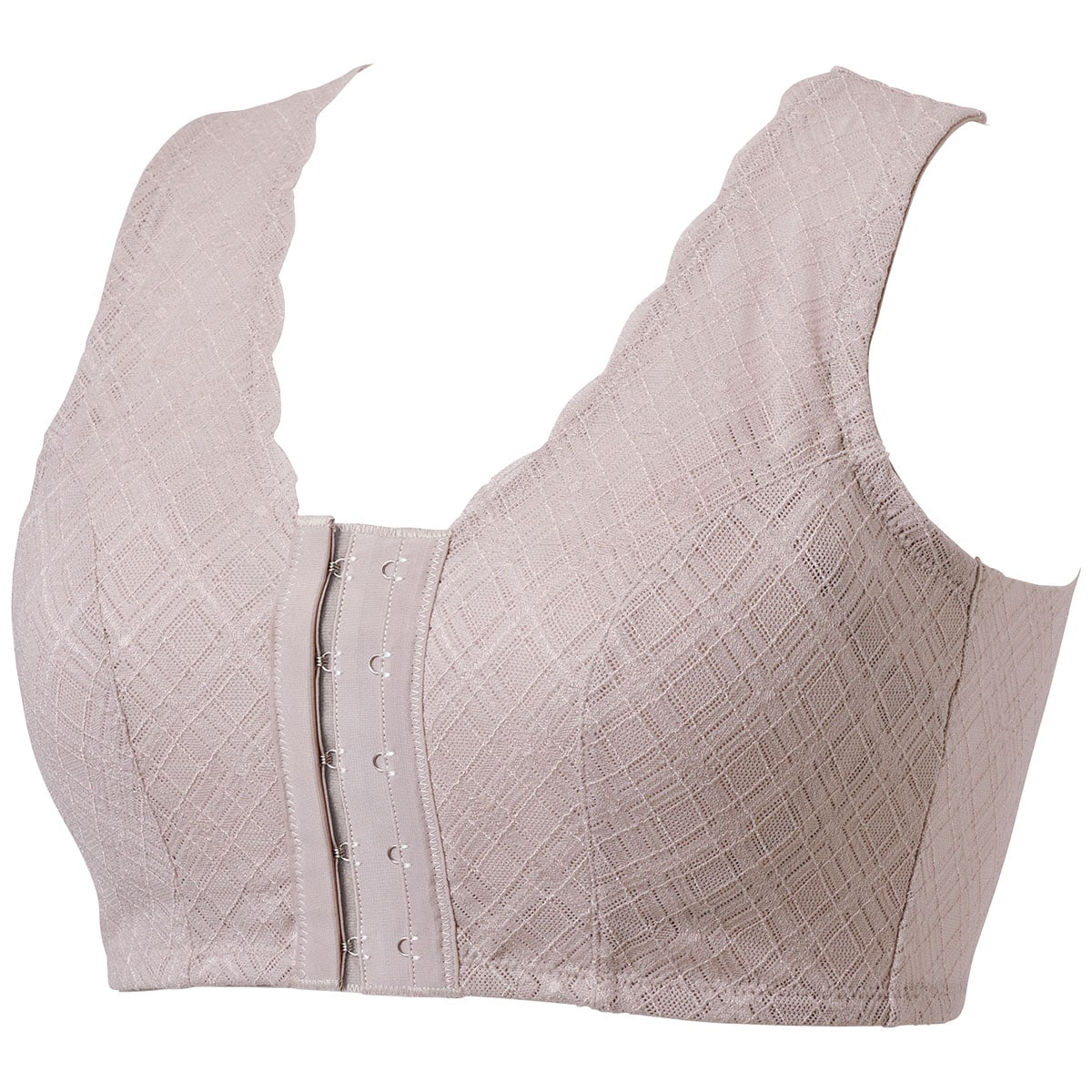 パワーのあるレースを使用して苦しくなく気持ちよく面でバストも背中もお肉をおさえます。カップは直立綿を使用、カップくりもメッシュ使用で通気性もよくムレを軽減。レースは脇はフリーカットでアウターにもひびきにくい。