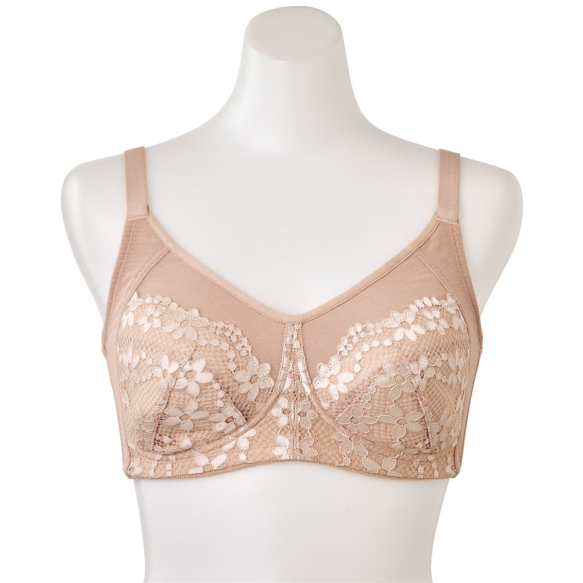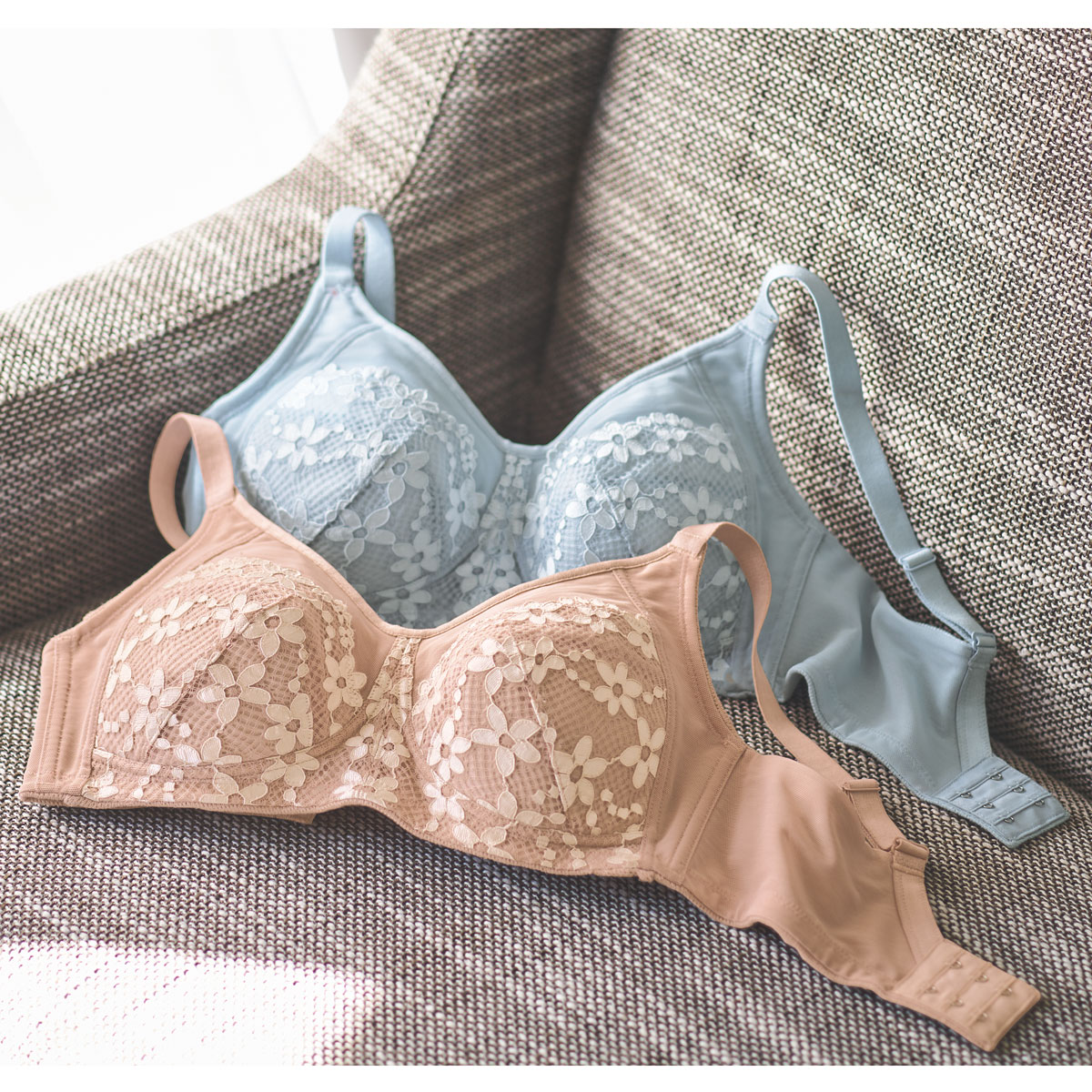 「かゆい」「痛い」を軽減。肌側綿95%素材で、とってもやさしいつけ心地のブラ。バストをすっぽり包む額ぶちタイプだから、ワイヤーなしでもホールド感があって安心。サイドボーンやゴムも綿混素材でくるみ、縫い目もほとんど肌側に出さないやさしさ仕様にこだわりました。チクチクする洗濯ネームは生地にプリント。デリケートなお肌の方にもおすすめできるやさしい、やさしい、ブラです。レースが華やかな大人っぽいデザインが魅力の綿混メッシュタイプ。