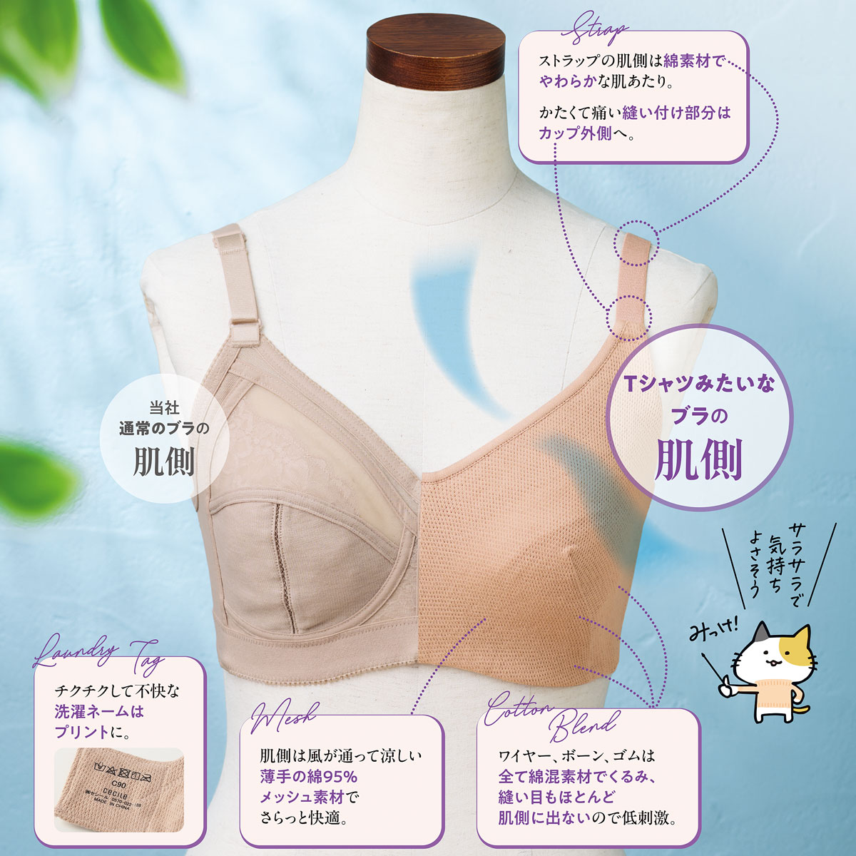 コーラルベージュ 当社通常のブラの肌側 Tシャツみたいなブラの肌側 (1)Strap ストラップの肌側は綿素材でやわらかな肌あたり。 かたくて痛い縫い付け部分はカップ外側へ。(2)Cotton Blend ワイヤー、ボーン、ゴムは全て綿混素材でくるみ、縫い目もほとんど肌側に出ないので低刺激。(3)Mesh 肌側は風が通って涼しい薄手の綿95%メッシュ素材でさらっと快適。