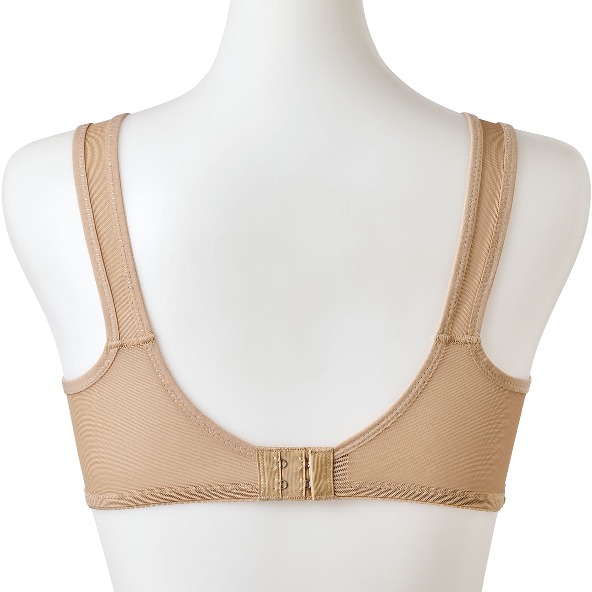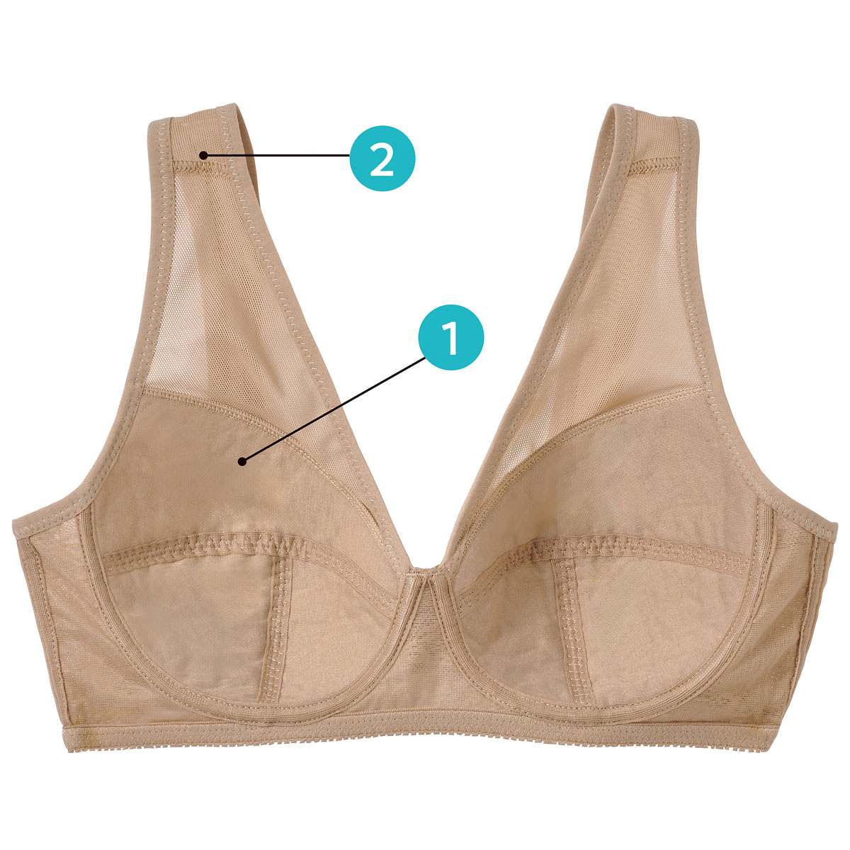 (1)バストをすっぽり包み込むフルカップデザイン。(2)幅広の肩ひもでくい込みにくくラク。