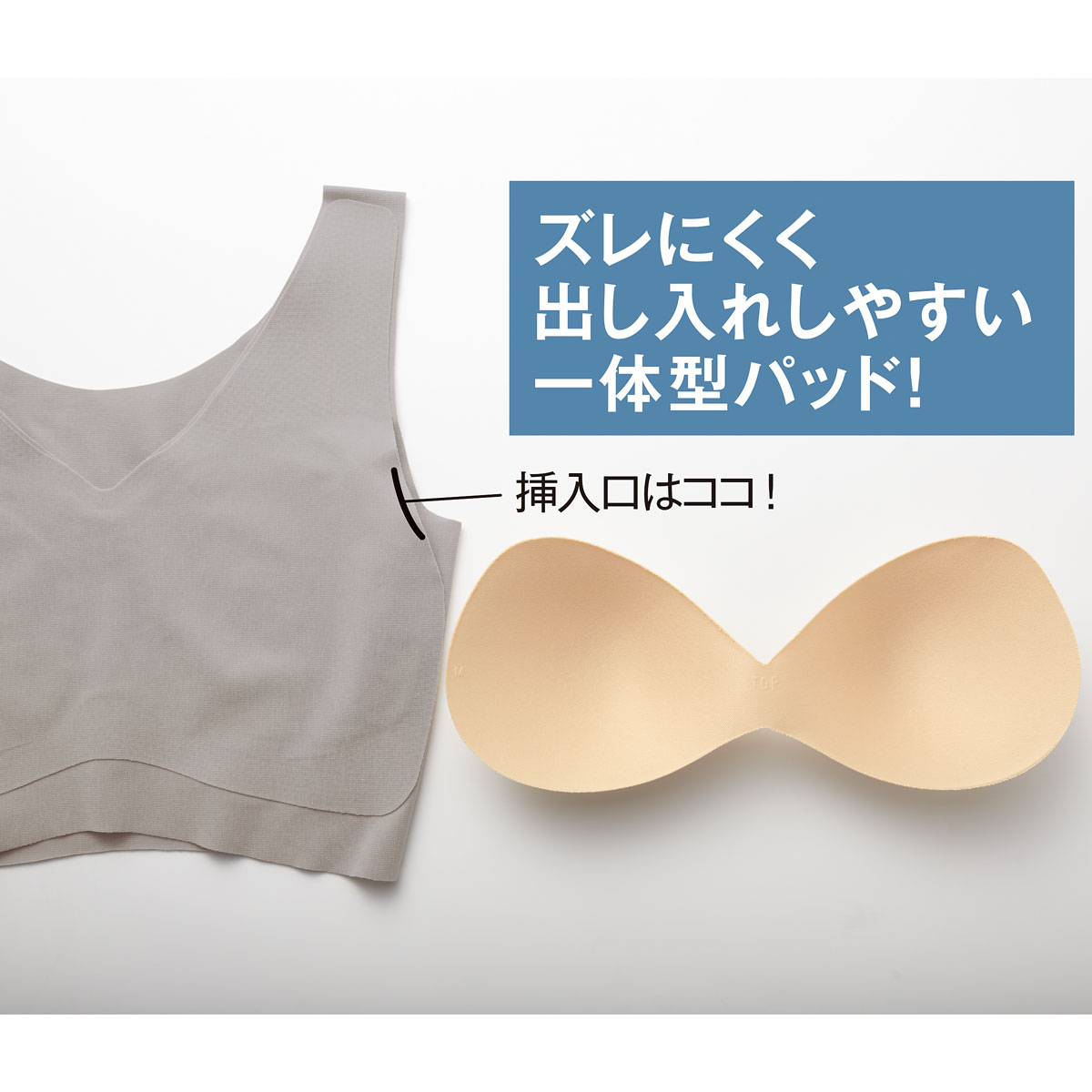 【シリーズ累計販売枚数17.9枚突破!(2025年8月現在)】ブラのしめつけ&圧迫が苦手な方におすすめ!ゴムも縫い目もゼロでくい込みにくく段差が出来ず、着け心地はまるでノーブラの100%シームレスブラ。ふわっと軽くてぐ~んと伸びる綿混タイプはセシレーヌで一番ラクな着用感。薄手でシャリ感のある綿混素材は肌ばなれが良く、年中快適!ズレにくく出し入れしやすい一体型パッドでバストを整えます。首元もVラインでアウターから見えにくい仕様。チクチクしにくいプリントの洗濯ネーム。