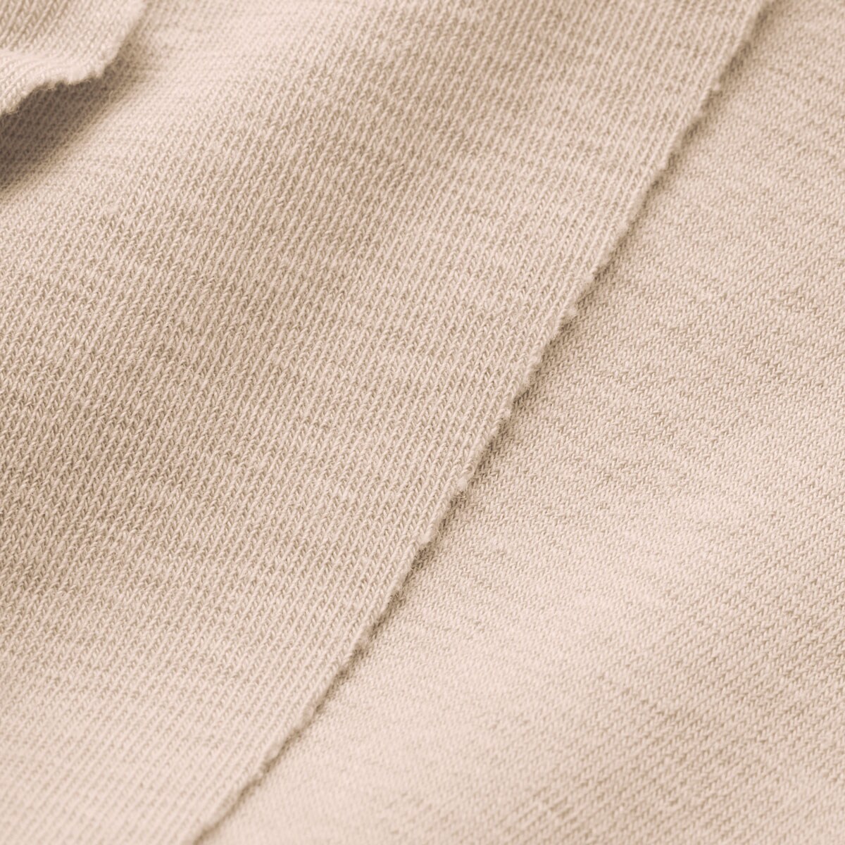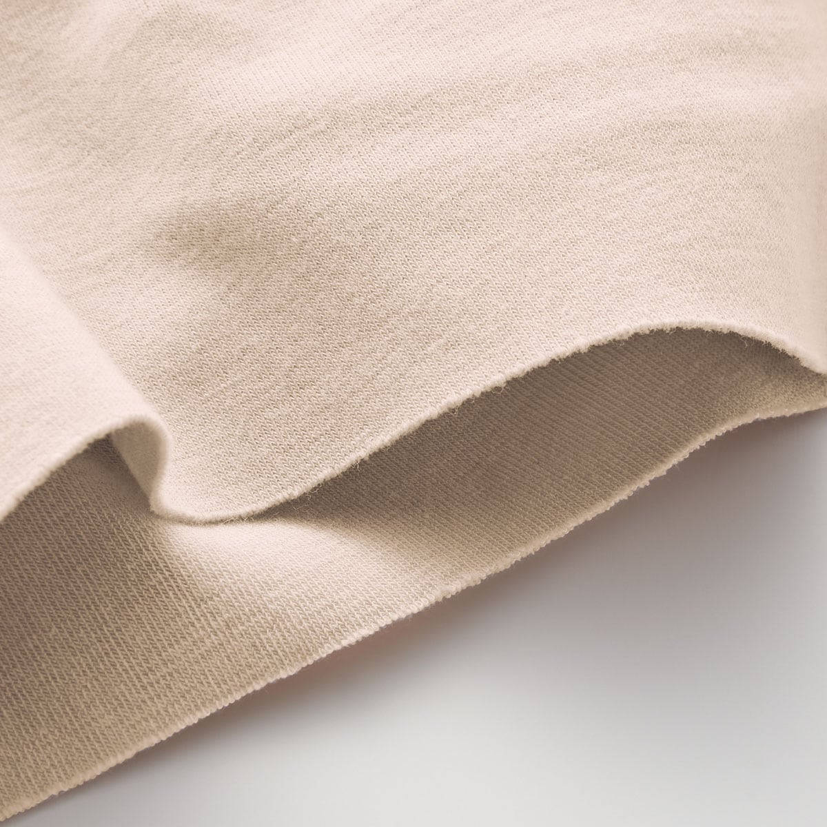 肩口や裾などは切りっぱなしで、ゴム不使用だから締めつけやくい込みなし。よく伸びて心地よくフィット。