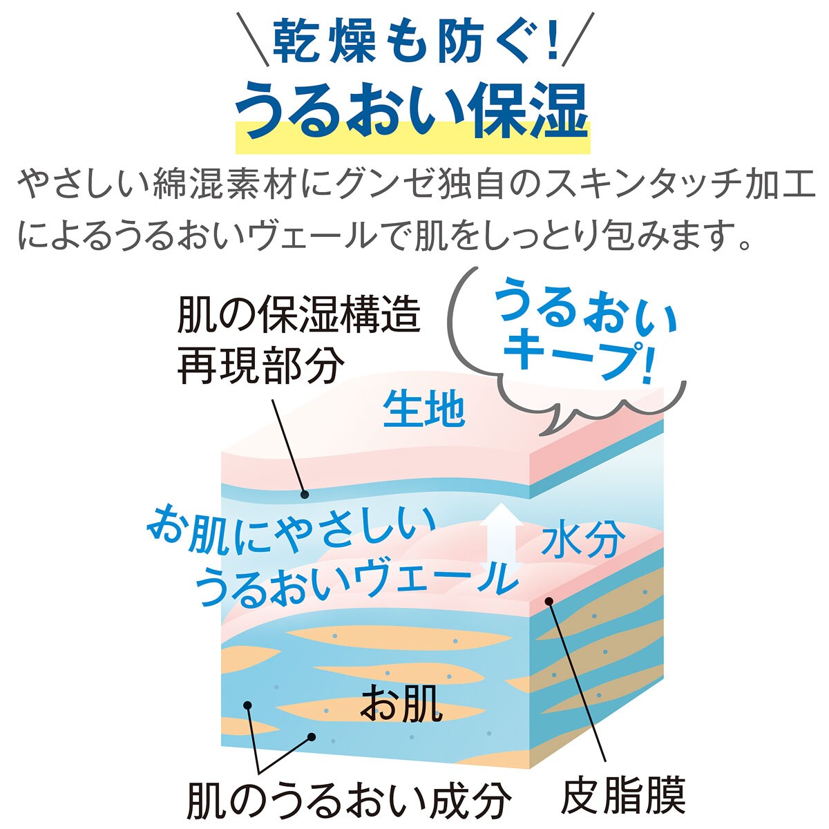 【乾燥も防ぐ! うるおい保湿】やさしい綿混素材にグンゼ独自のスキンタッチ加工によるうるおいヴェールで肌をしっとり包み、うるおいキープ!