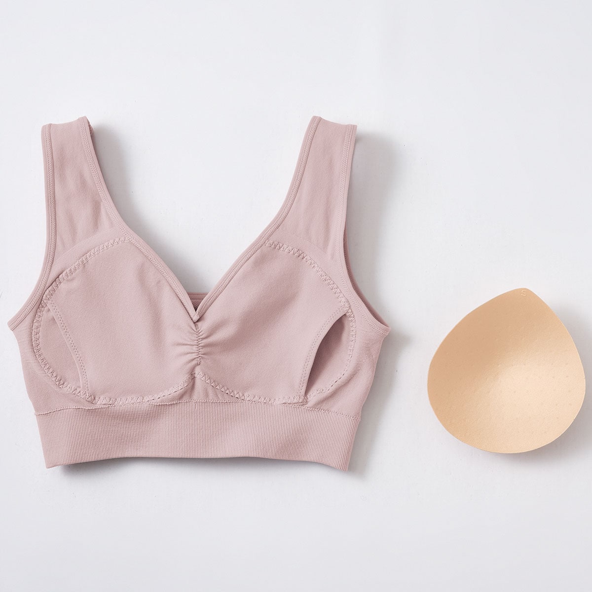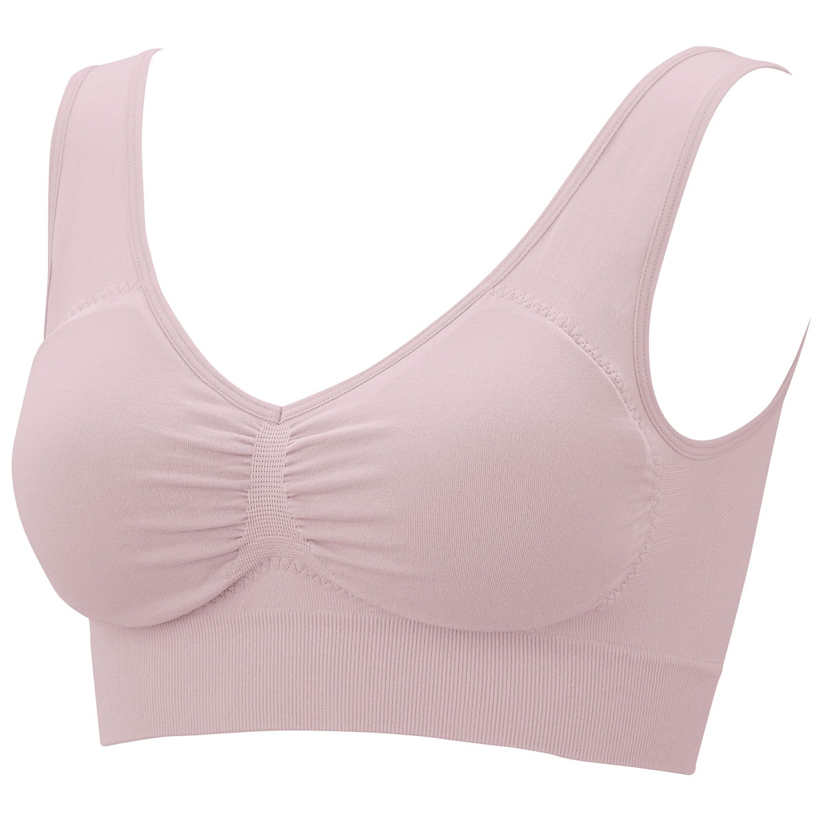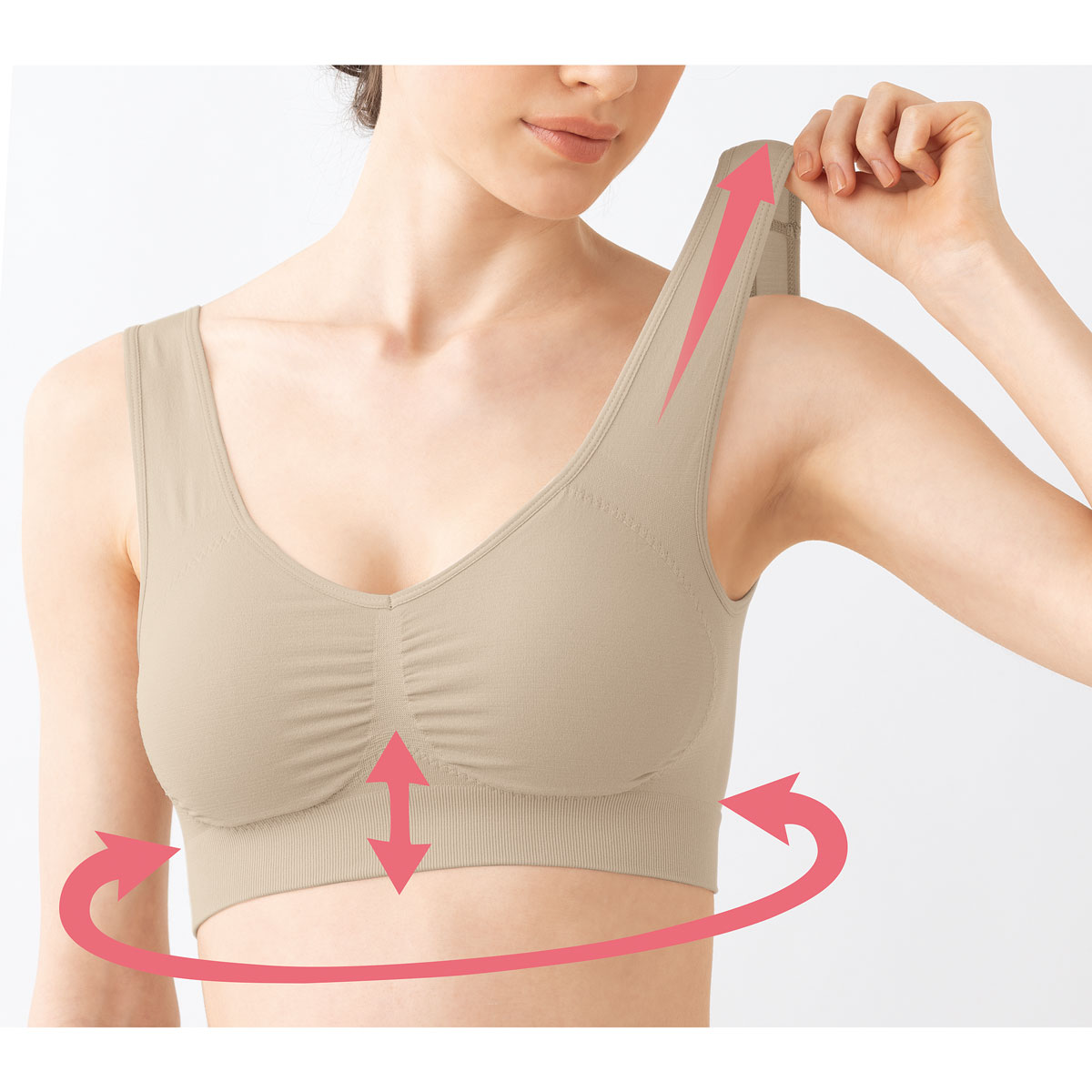 ノーブラ気分でキレイが叶う毎日着たいブラのメッシュタイプ!ストラップ・バストと背中が通気性のよいメッシュ素材で、涼しくサラッサラ!あらゆる角度にぐーんと伸びる薄手素材が皮膚のように体になじみストレスを感じさせない着心地。バストサイドの編みわけと取り出し可能な下厚で深さのある立体丸パッドで、サイドすっきりでぷるんと美しい丸胸をメイク。背中も脇も広くカバーする段差なしの360度すっきりシルエットでキレイとラクが両立するから、日中のブラとしても、おやすみブラにもおすすめです。ホットヨガのインナーにも。
