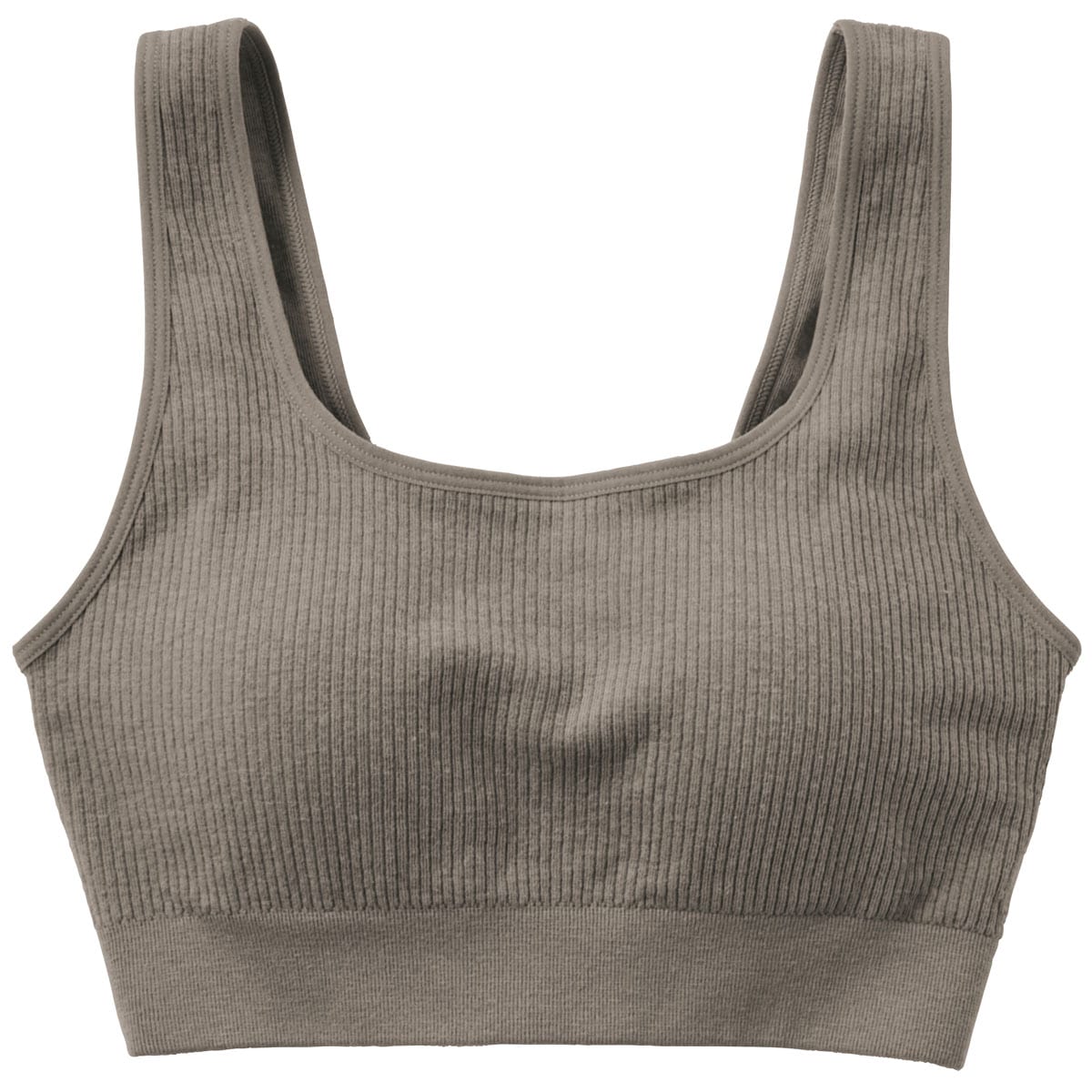 ソフトカーキ (肌側) (1)見た目よりグ~ンと伸びて、ピタッとフィット。(2)カップは縫い付けで、動いてもズレの心配なし。(3)幅広アンダーは、アクティブな動きでもズリ上がりにくい。