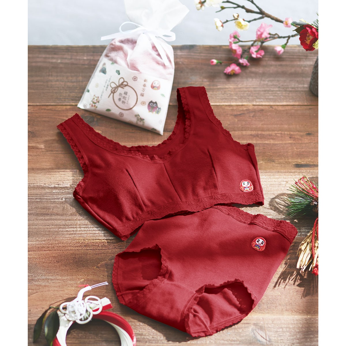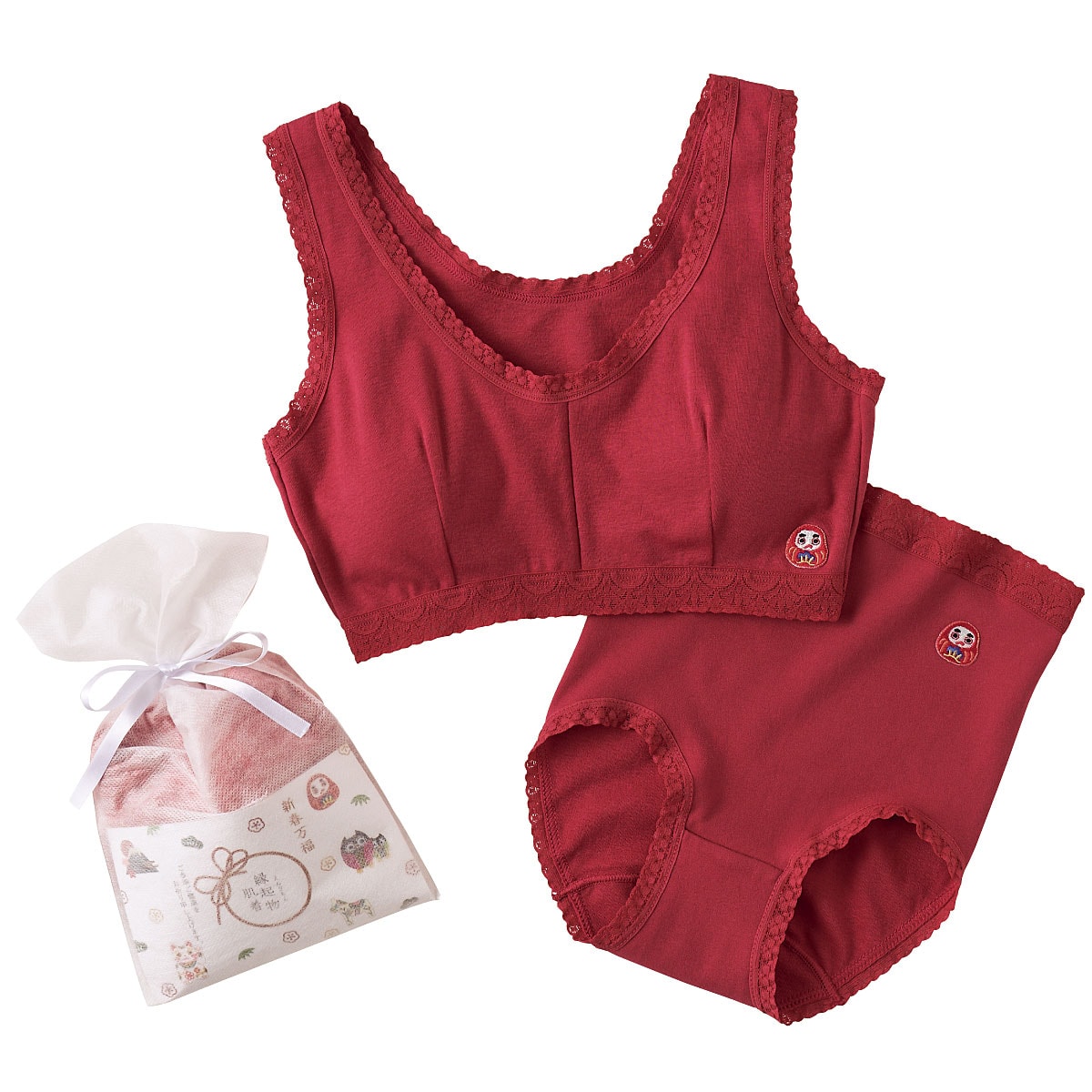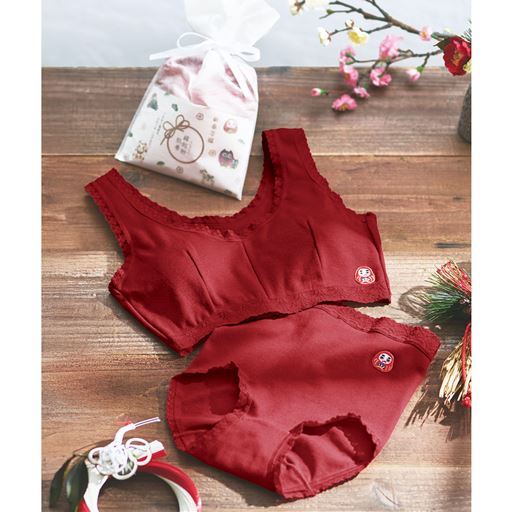 プレゼントにもおすすめな巾着入りのブラ&ショーツセットは縁起のいい赤色にだるまのアップリケ付き♪セットA(だるま)