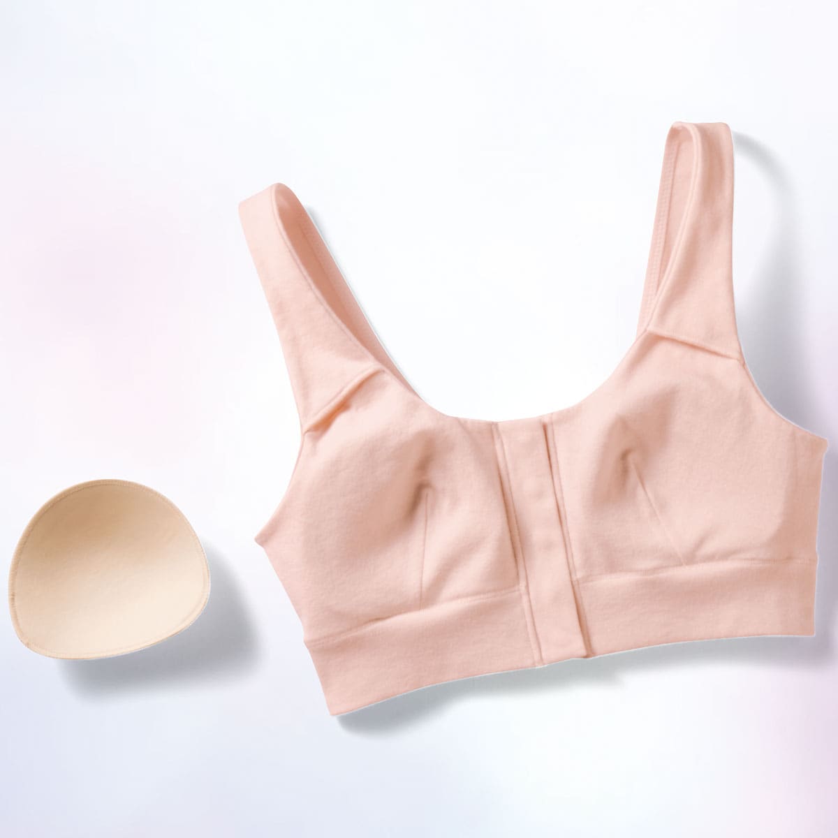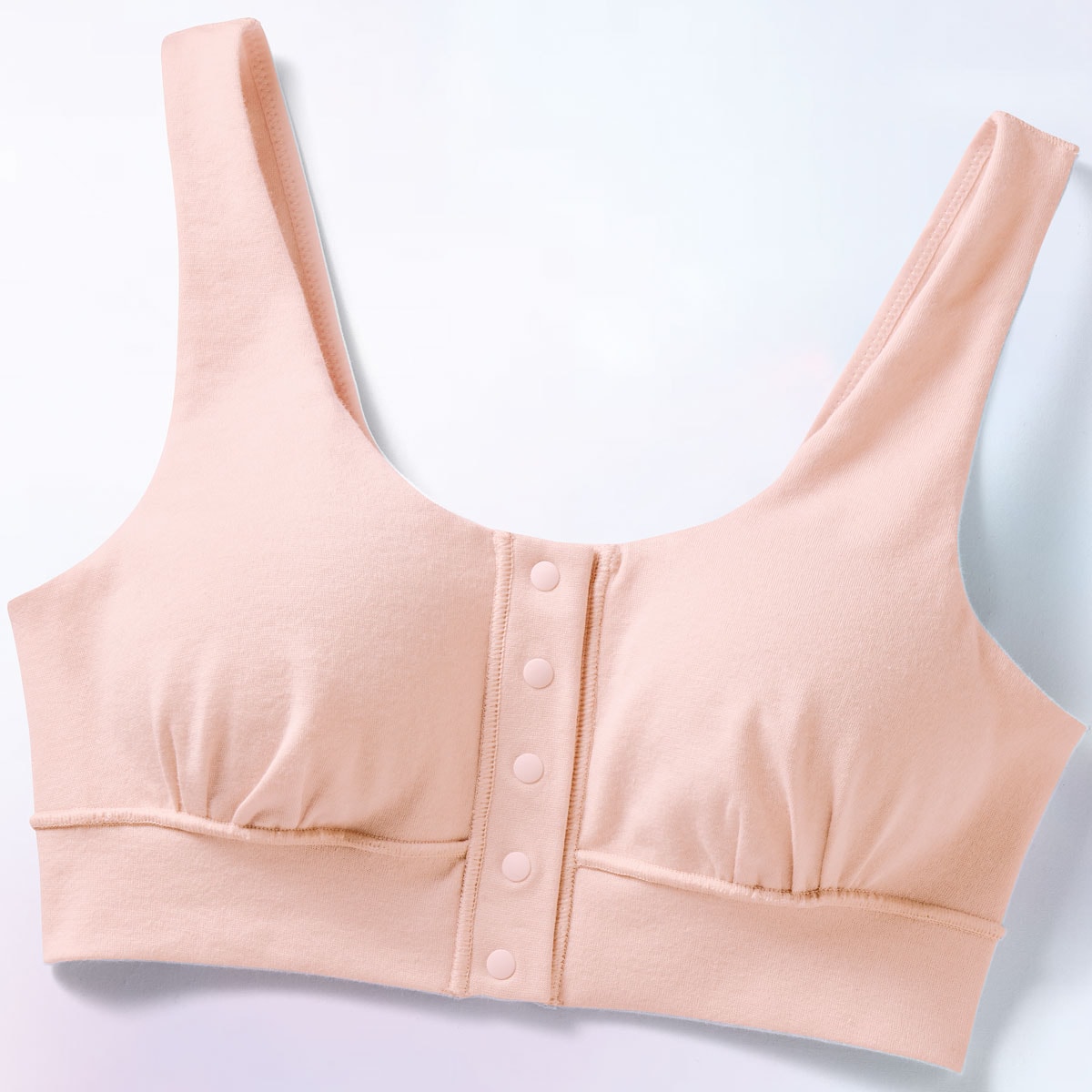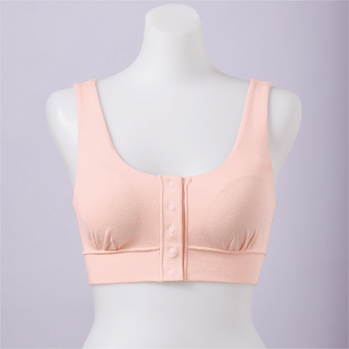 乳がんを経験された方のための、やさしさにこだわったブレストケアブラ。こだわりの綿混素材を使用し肌当たりをとことん考え抜きました。フロントスナップで着脱しやすいハーフトップブラ