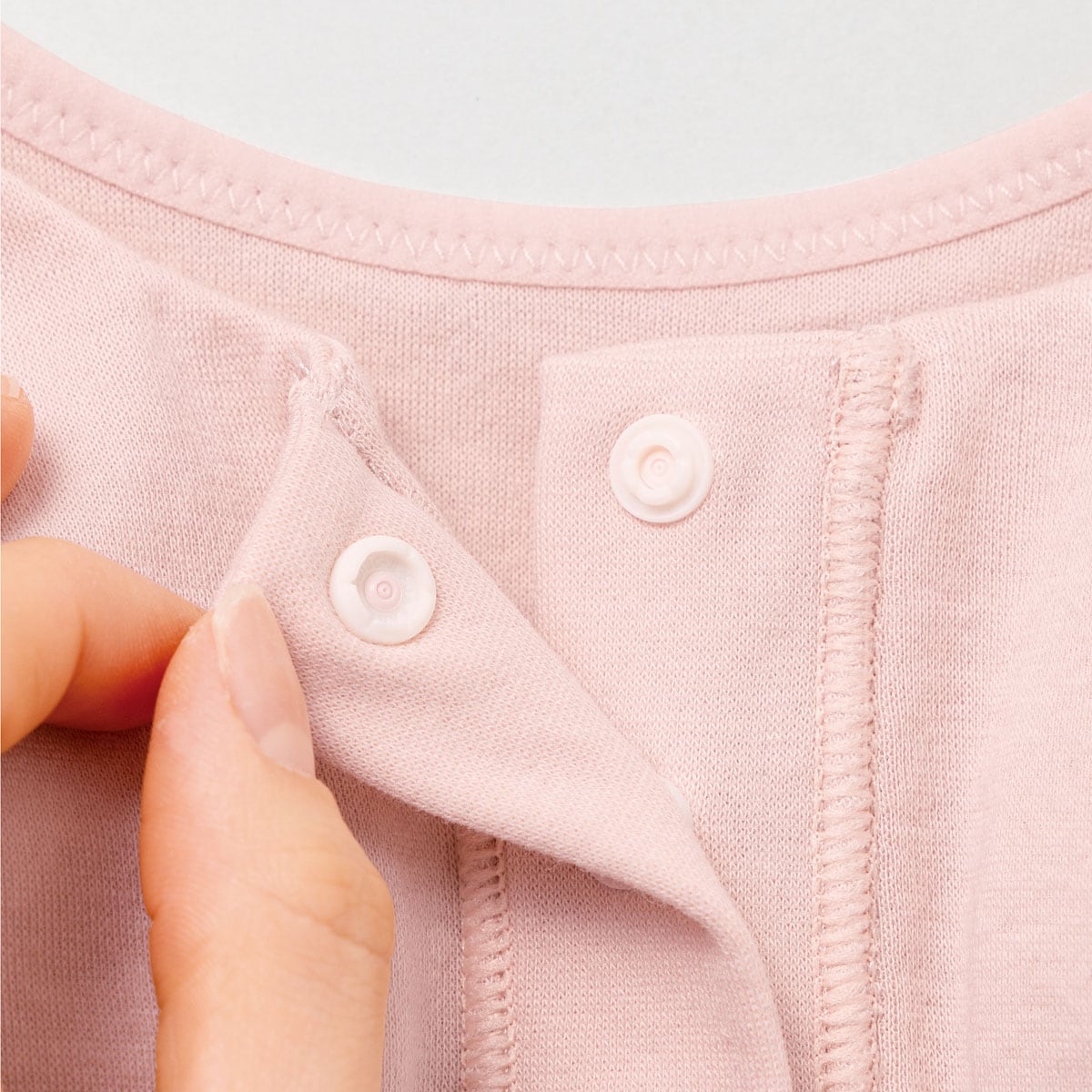 着脱しやすい前開き フロントのスナップボタンで脱ぎ着がラク。