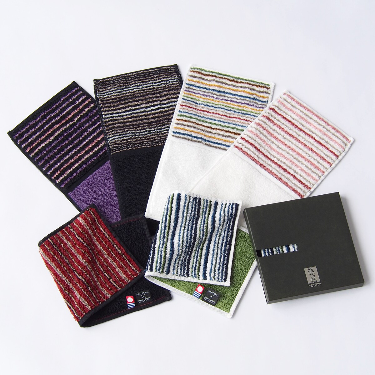 多彩で立体的な縞模様が特徴の小倉織「SHIMA-SHIMA」ブランドと、老舗の今治タオルメーカー田中産業の「GOLDPEARL」がコラボしたハーフタオルハンカチです。男性のプレゼントにもおすすめです。