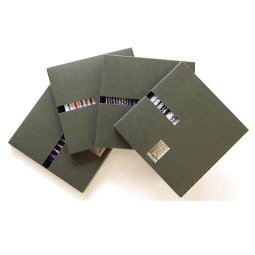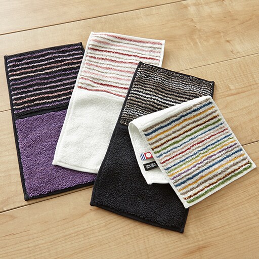 (左から) D (紫紅)・C (花衣×水衣)・A (無彩リバーシブル)・B (白多彩×白雨)小倉織の世界をタオルで表現。男性のプレゼントにもおすすめです。