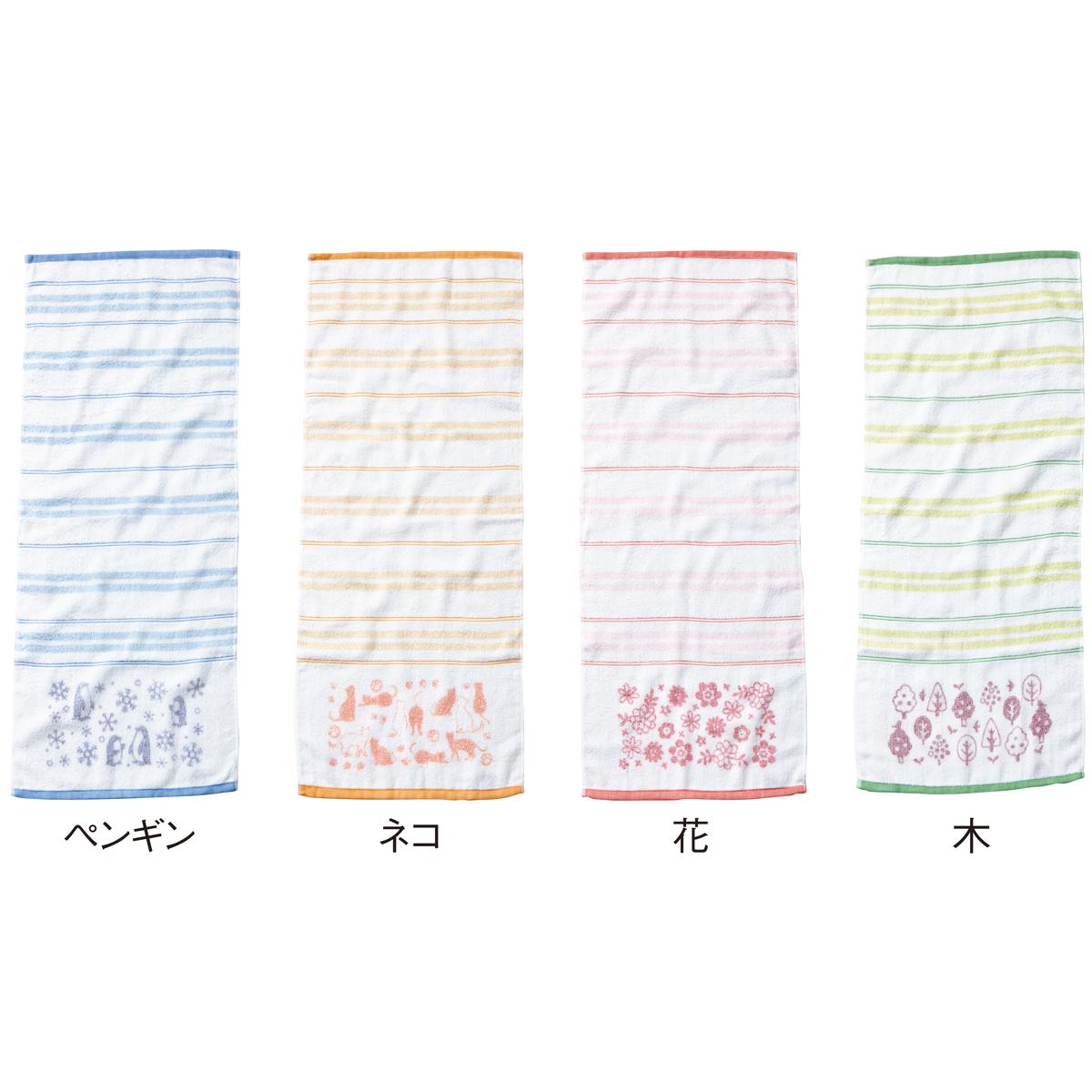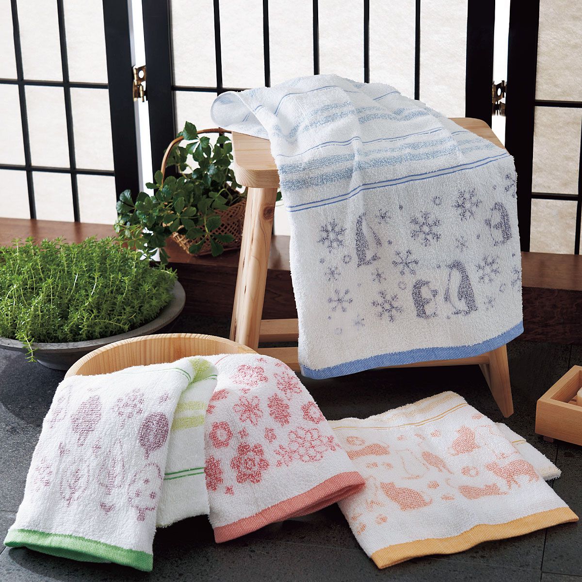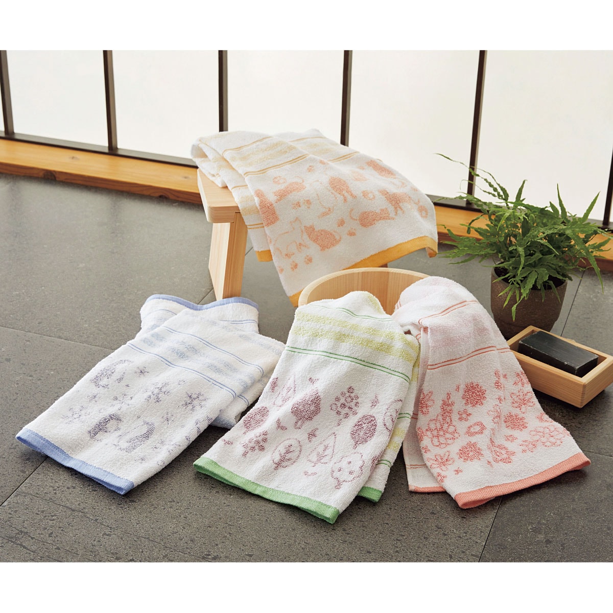 綿の風合いが心地よい肌ざわり。120年を超えるタオルづくりの歴史をもつ、大阪・泉州産のタオルです。薄いながらも吸水性に優れており、ジムやヨガ・旅行など持ち運ぶシーンでの手ぬぐいとしてもおすすめ。フェイスタオルは一般的なタオルより5cm長く、絞りやすくてしっかりした生地なので、力を入れずさっぱりと洗えて浴用にも便利です。かわいい花柄やネコ柄など、セシールオリジナルのプリント柄をご用意しました。お得にまとめ買いできる柄違いの4枚組セットでお届けします。