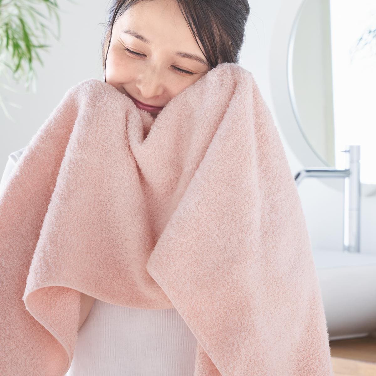 セシールと今治のタオルメーカーとの10 年間の取り組みの中で、ようやく完成した「毛羽の出にくい無撚糸タオル」。デリケートな素肌にご褒美を。そっと触れるだけで幸せ感じるやさしい肌ざわり。