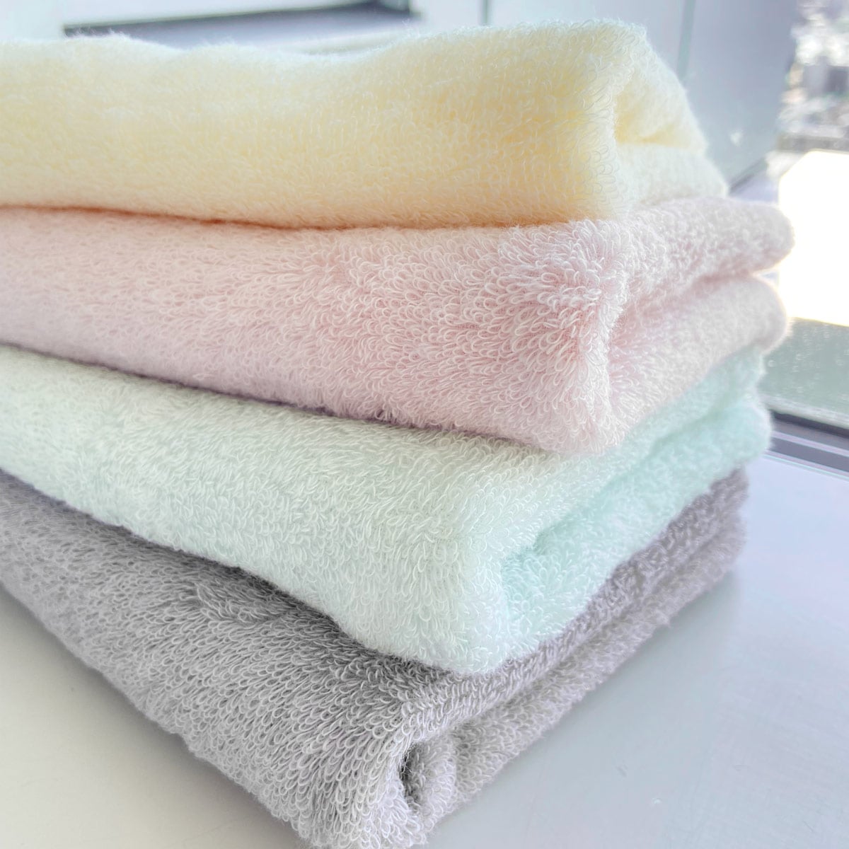 (上から) D (はちみついろ)・A (そらいろ)・B (さくらいろ)・C (かすみいろ)赤ちゃんを包む産着のようなやさしさを目指した、空気のようなタオルです。