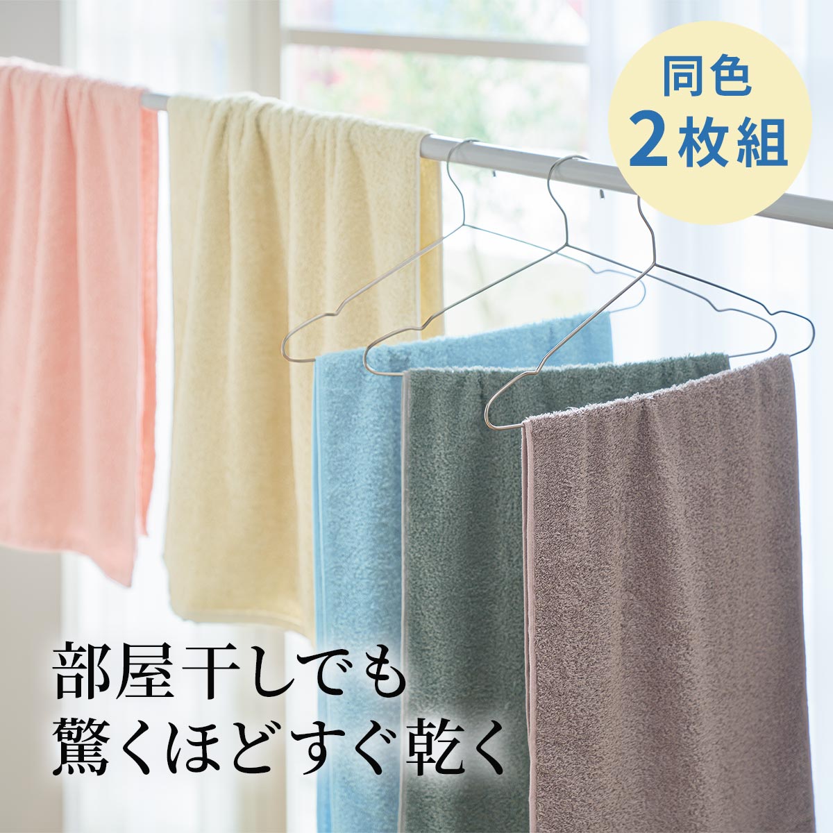 洗濯脱水するだけでびっくりするほどすぐ乾く、吸水速乾性に優れたタオルです。洗濯物が乾きにくいジメジメした季節におすすめ。洗い替えに何枚あっても重宝します。同色2枚組でお届けします。