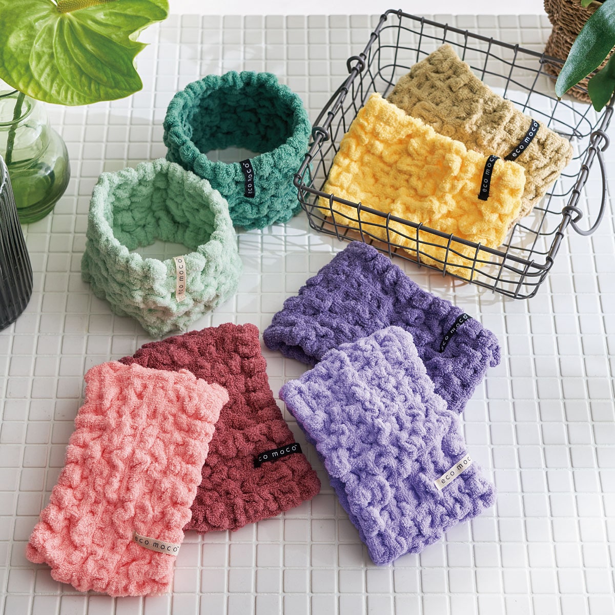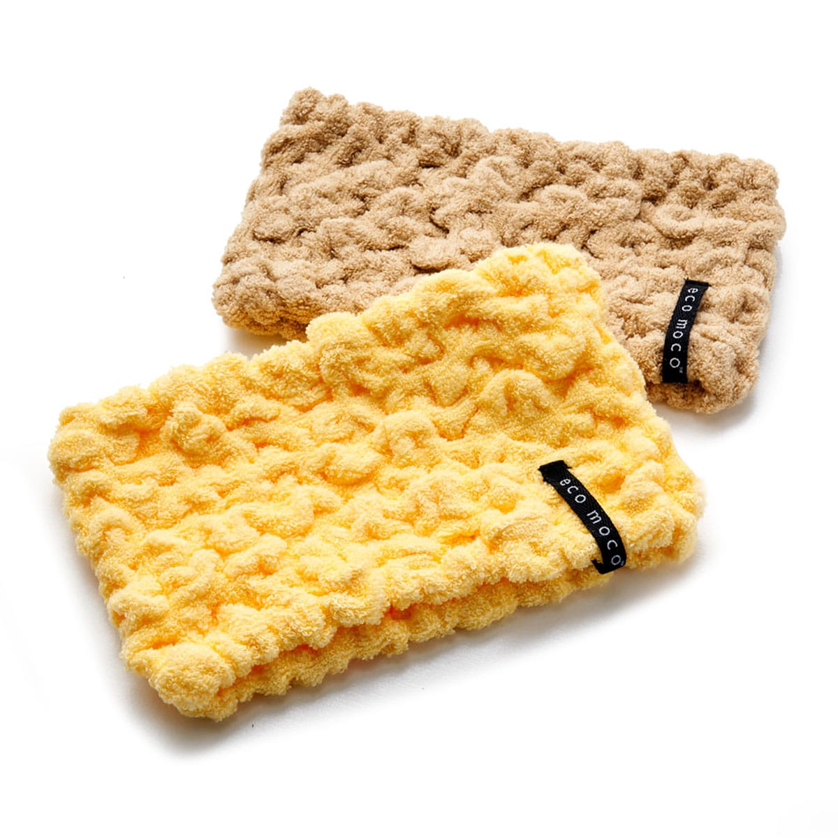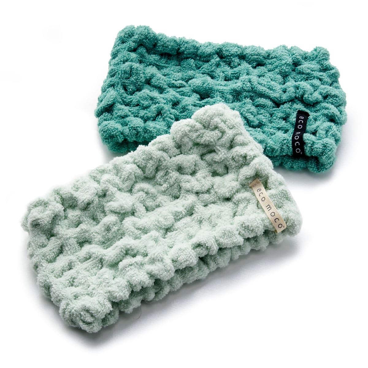 広幅タイプですっぽり髪を包んでくれる、エコモコへアバンドです。タテ糸とヨコ糸に伸縮性のある糸を織り込み、熱処理して伸縮させることで、モコモコタッチのユニークな形状に。ソフトな風合いとふんわり心地よい肌ざわりで、吸水性もバッチリです。洗顔やお風呂上がりはもちろん、ジムやプールの後にもおすすめ。おしゃれなニュアンスカラーをご用意しました。洗い替えにも便利な色違いの2枚組でお届けします。