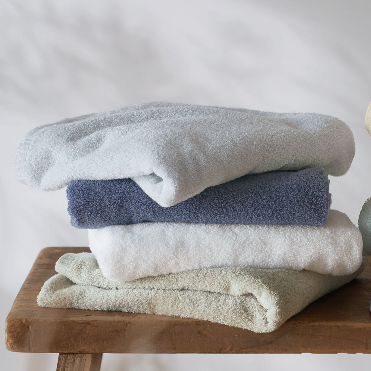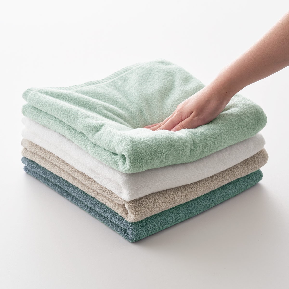 (上から) クラウドブルー・ソフトブルー・オフホワイト・ライトグレージュほどよい厚みでしっかり拭ける、軽くてちょうどいいやわふわタオルです。