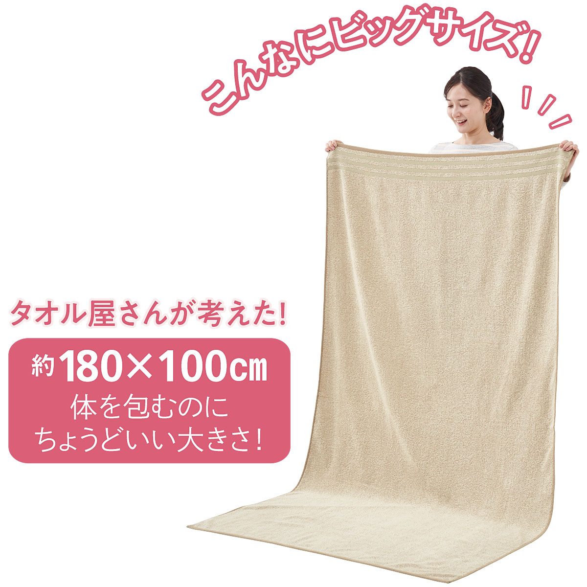 タオル屋さんが考えた! 綿100%のパイル生地の超大判バスタオルがリニューアル。乾きやすさを改良し、さらに使いやすくなりました。体を包むのにちょうどいい大きさでソファの汗除けや入院用のケットなど、使い方は自由自在。タオル1枚の厚さの軽い掛け心地で、折り返しがないから首元の息苦しさも解消します。気軽にお洗濯できるので、いつも清潔を保てます。