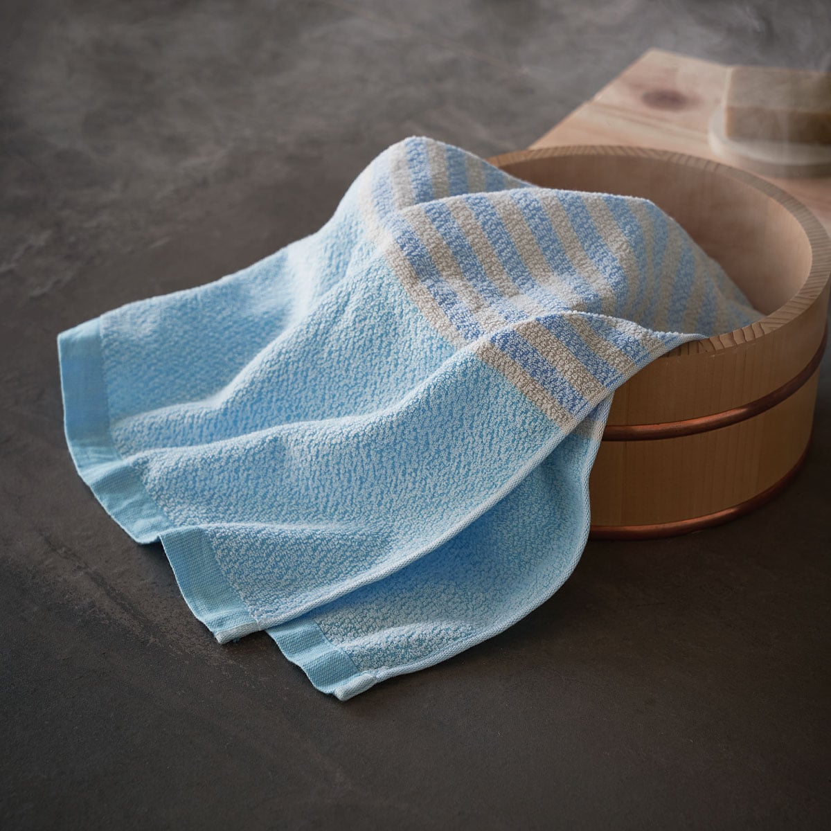 ブルー系(フェイスタオル)短めのパイルでやさしく洗えるので、浴用としてもおすすめ。