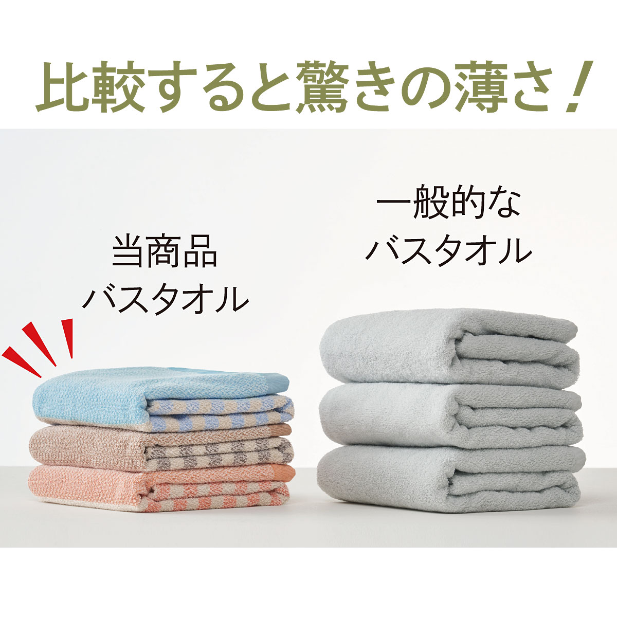バスタオルは、一般的なフェイスタオル1枚分くらいに畳める薄さ。洗濯もラクで乾きやすい!