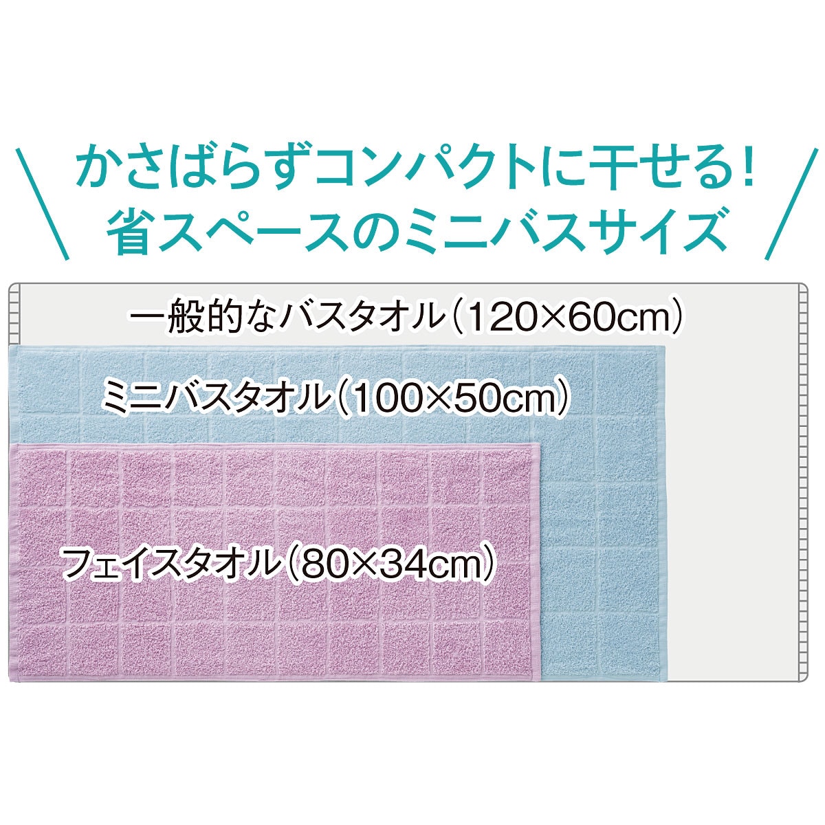 かさばらずコンパクトに干せる! 省スペースのミニバスタオルサイズもご用意しています。