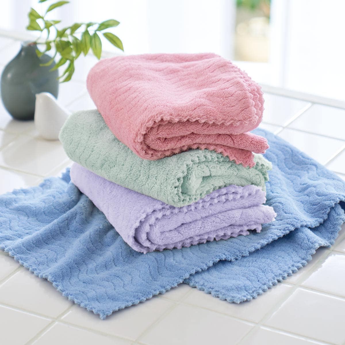 (上から) ピンク・ミントグリーン・ラベンダー・ブルータオルドライ時の摩擦を軽減させ「整う」髪へ。吸水美神タオルです。