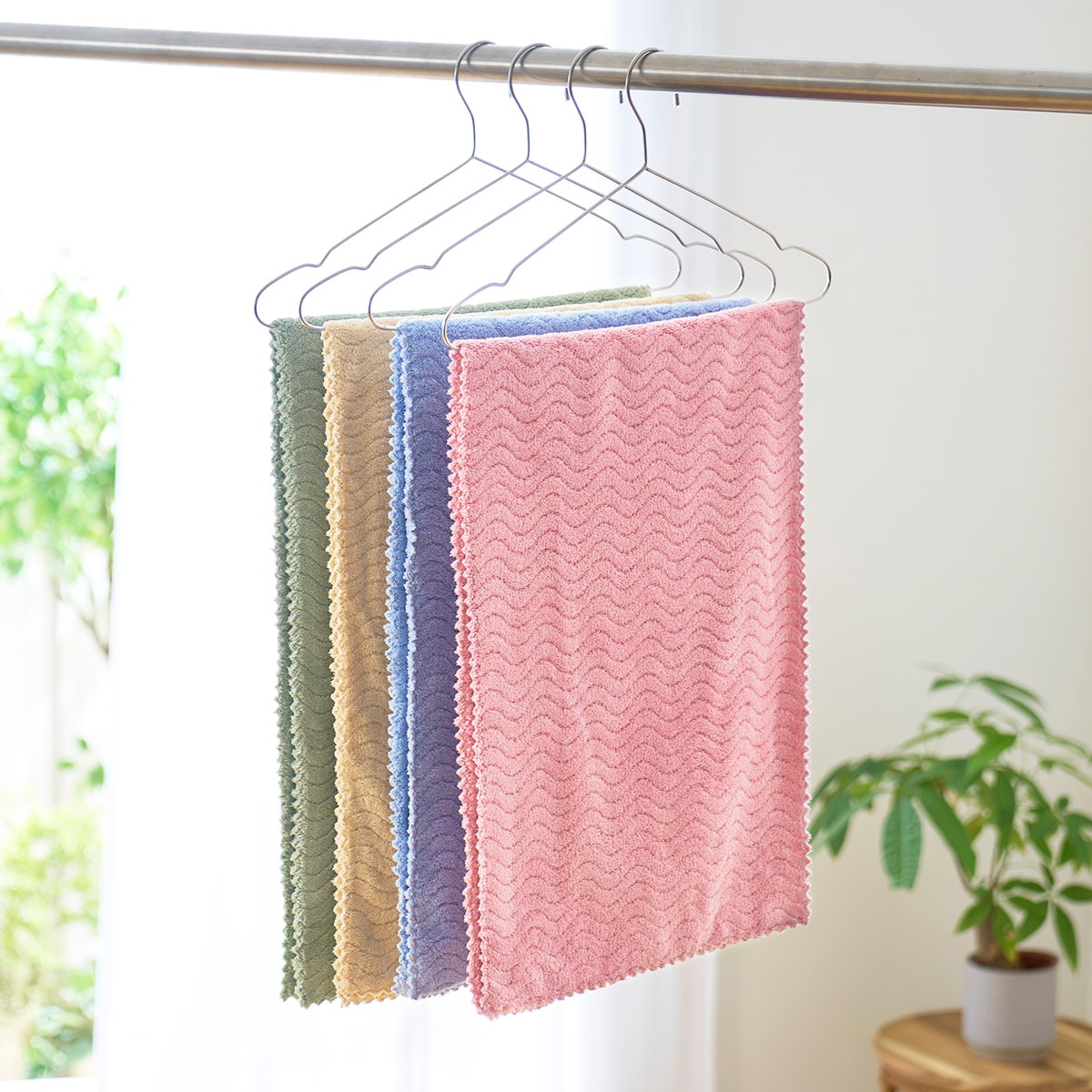 (左から)グリーン・ベージュ・ブルー・ピンクロングフェイスタオルはハンガーに干せるちょうどいいサイズ感。洗濯物の量が減って収納もすっきり!