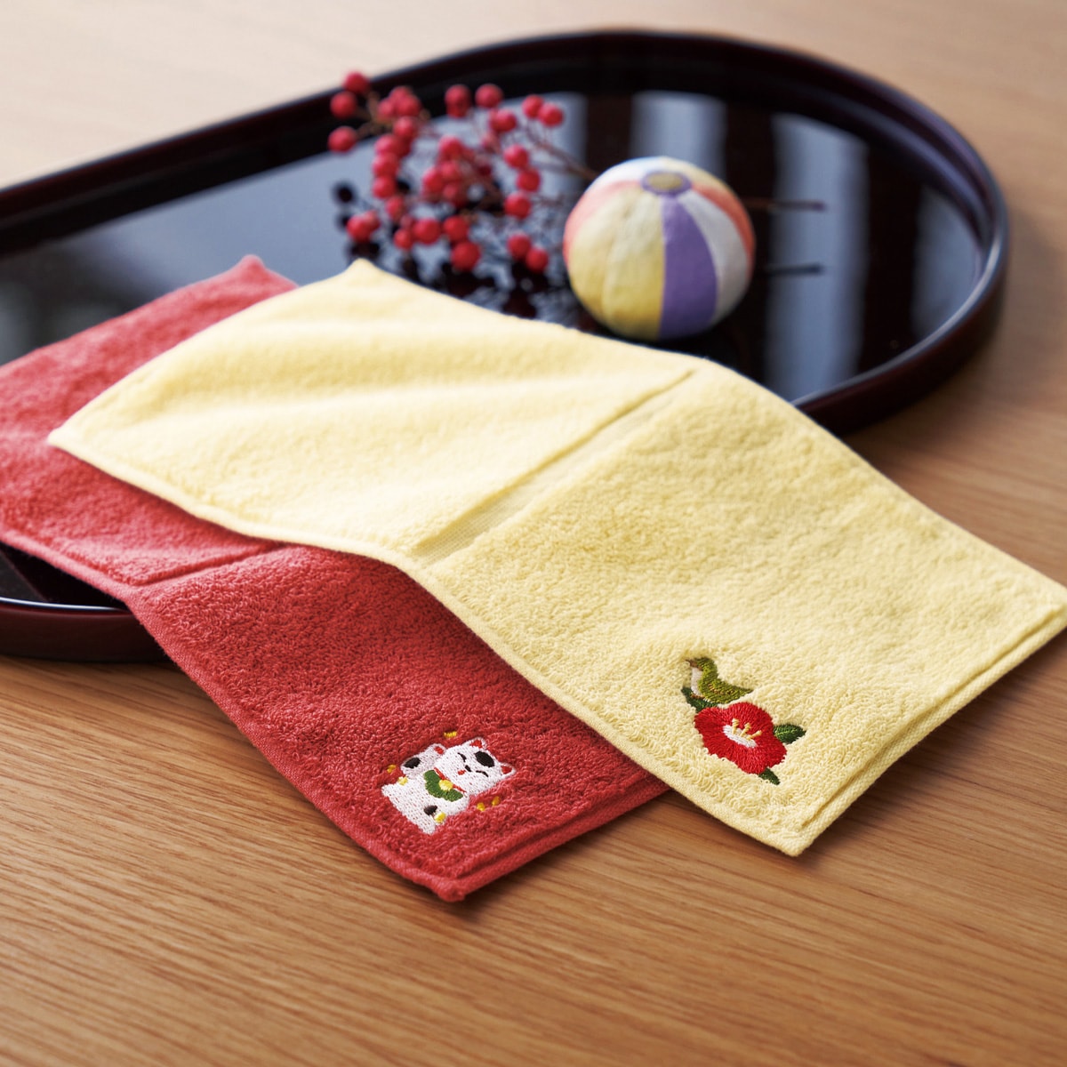 コンパクトに携帯できる、ハーフサイズのタオルハンカチです。センターに折り目を入れて二つ折りしやすく、バッグ内でもかさばりにくい。紅色に福を呼ぶ「招き猫」のモチーフと、優しい薄黄色にメジロと椿をワンポイント刺繍したかわいい2枚セット。新年には大切な人へタオルを贈って「縁」を呼び込みましょう!