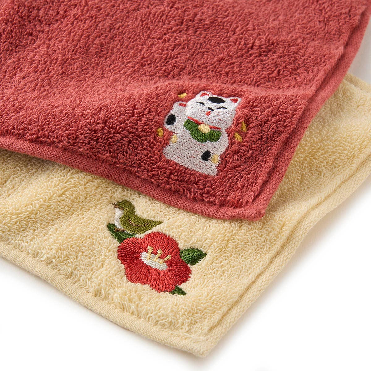 コンパクトに携帯できる、ハーフサイズのタオルハンカチです。センターに折り目を入れて二つ折りしやすく、バッグ内でもかさばりにくい。紅色に福を呼ぶ「招き猫」のモチーフと、優しい薄黄色にメジロと椿をワンポイント刺繍したかわいい2枚セット。新年には大切な人へタオルを贈って「縁」を呼び込みましょう!