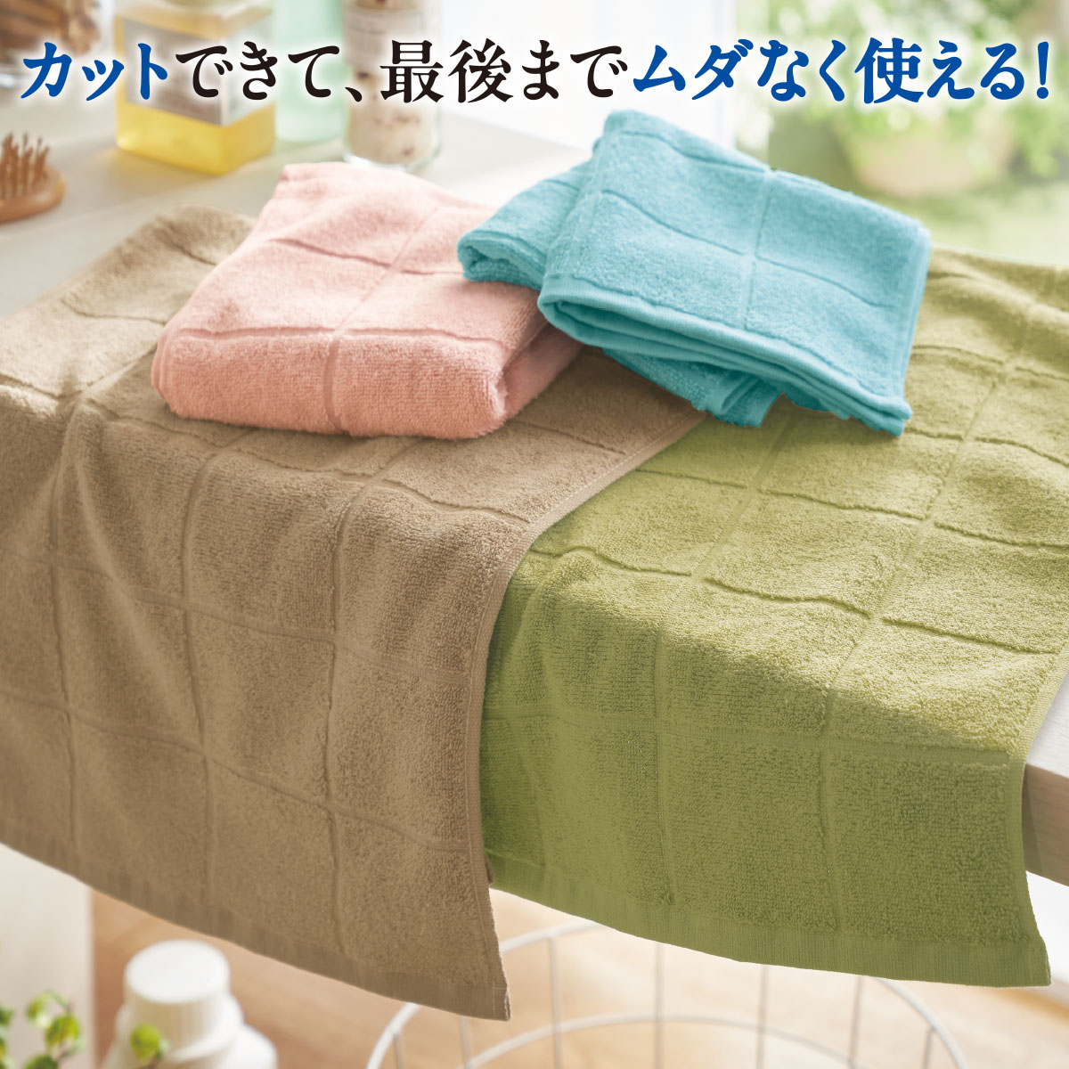 やや薄手で使いやすいほど良い厚みに改良! さらに甘撚りのやわらかタッチでよりふんわり気持ちよく。ミニバスサイズから使いやすいバスタオルサイズに見直しました。格子ラインに合わせてカットでき、再利用可能。フローリングワイパーやお掃除クロスに。